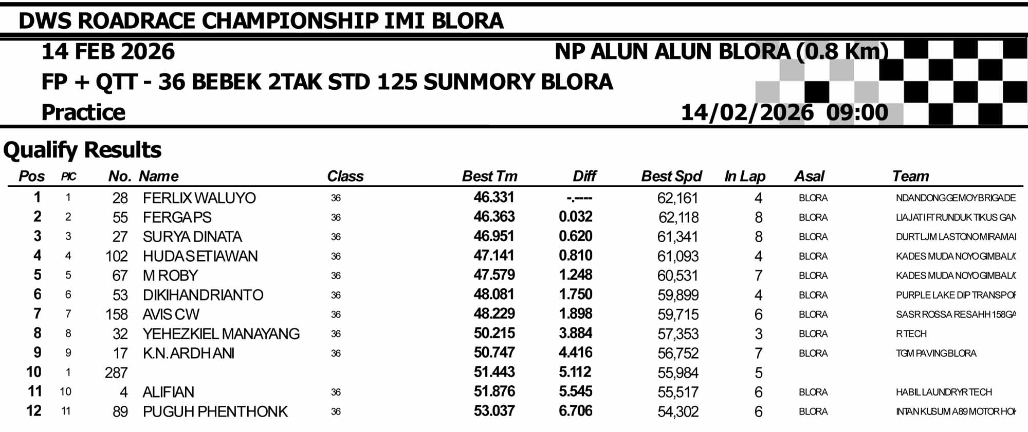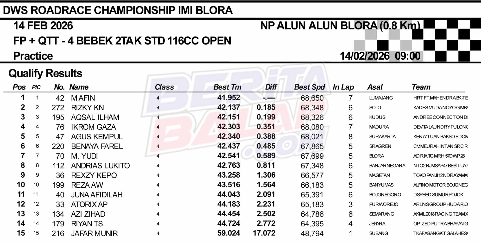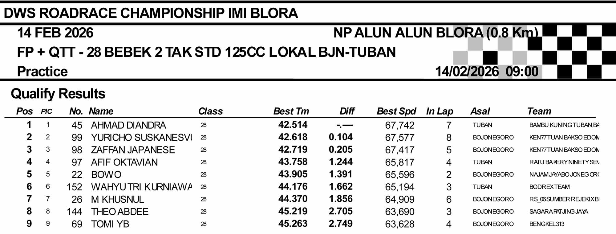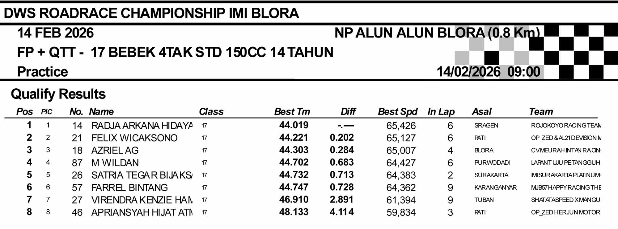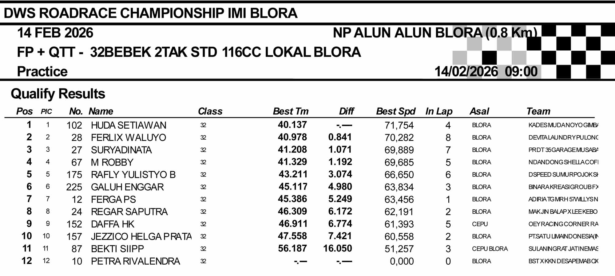 Headline Road Race 14 Februari, 2026 Hasil Kualifikasi DWS Road Race Championship 2026 Blora Posted By: BeritaBalap.com DWS Road Race Championship 2026 Blora, Hasil DWS Road Race Championship 2026 Blora, Hasil Kualifikasi DWS Road Race Championship 2026 Blora BeritaBalap.com- Berikut ini adalah hasil kualifikasi DWS Road Race Championship 2026 yang ber;angsunh dilintasan NP Alun-Alun Blora pada Sabtu, 14 Februari. R4NU