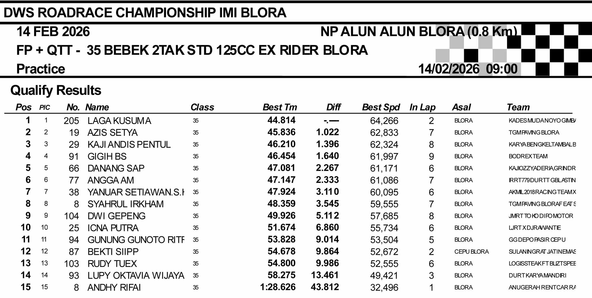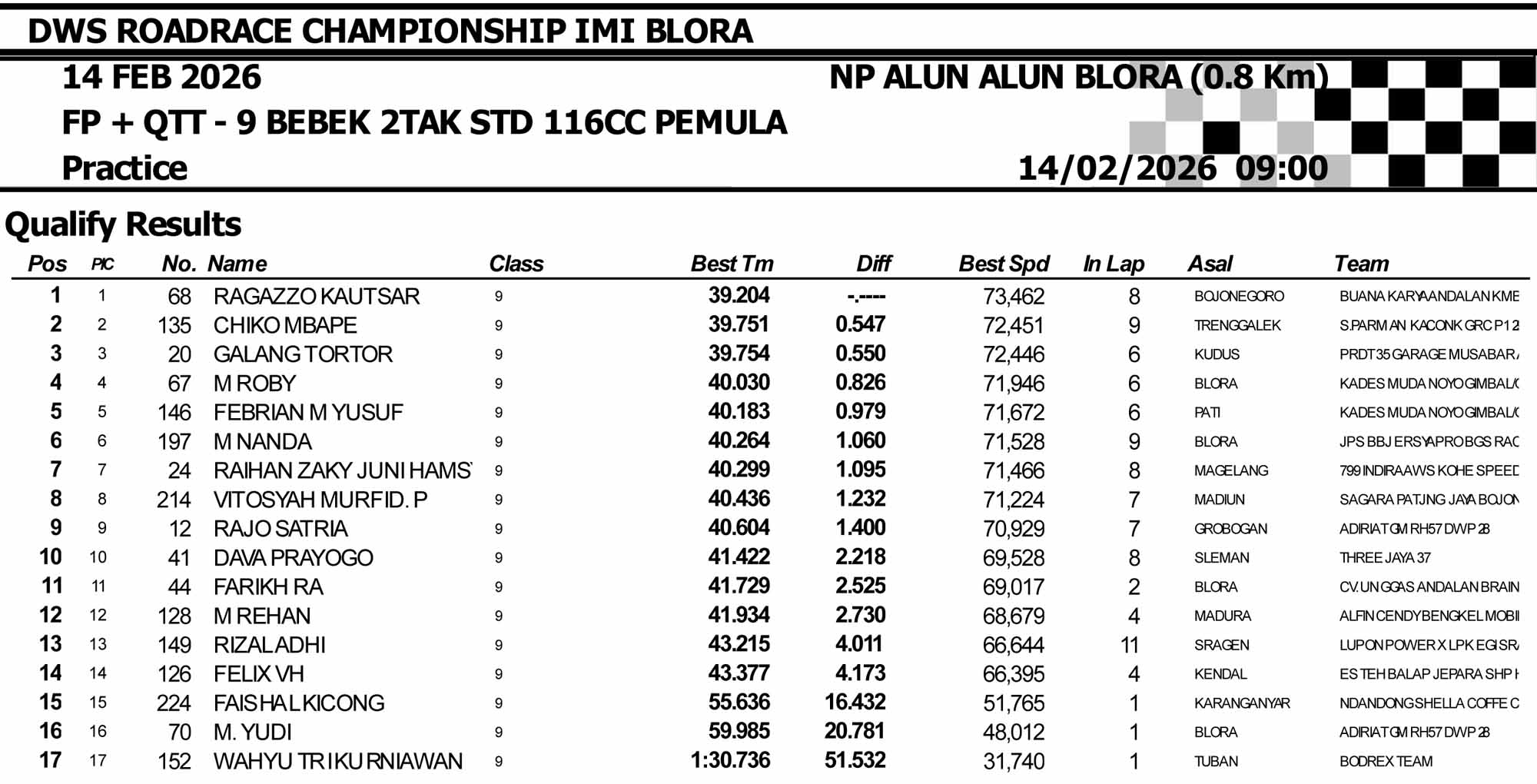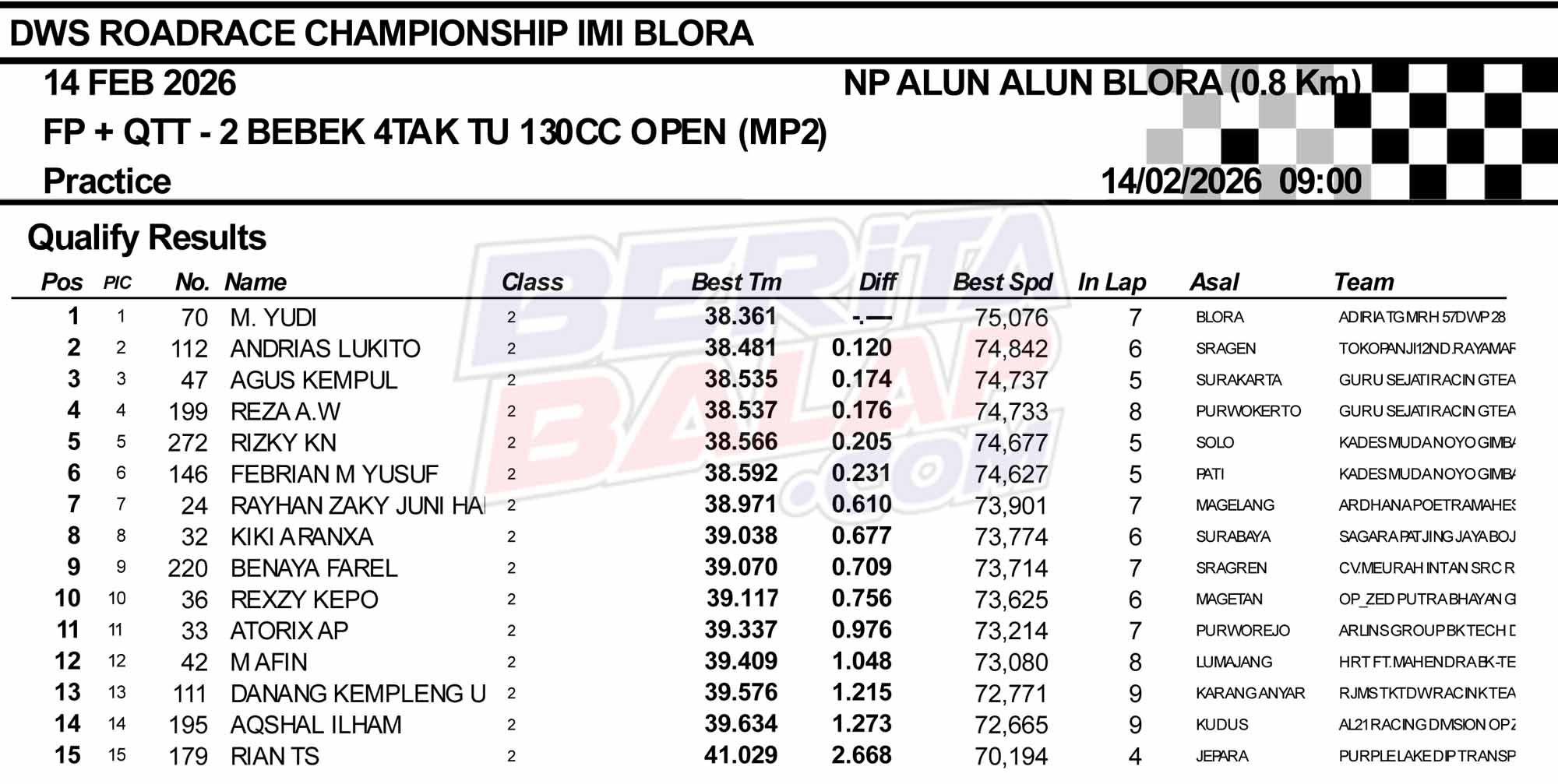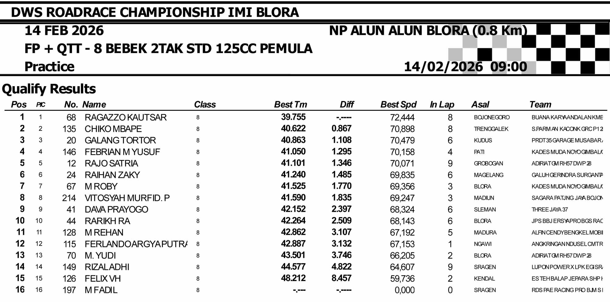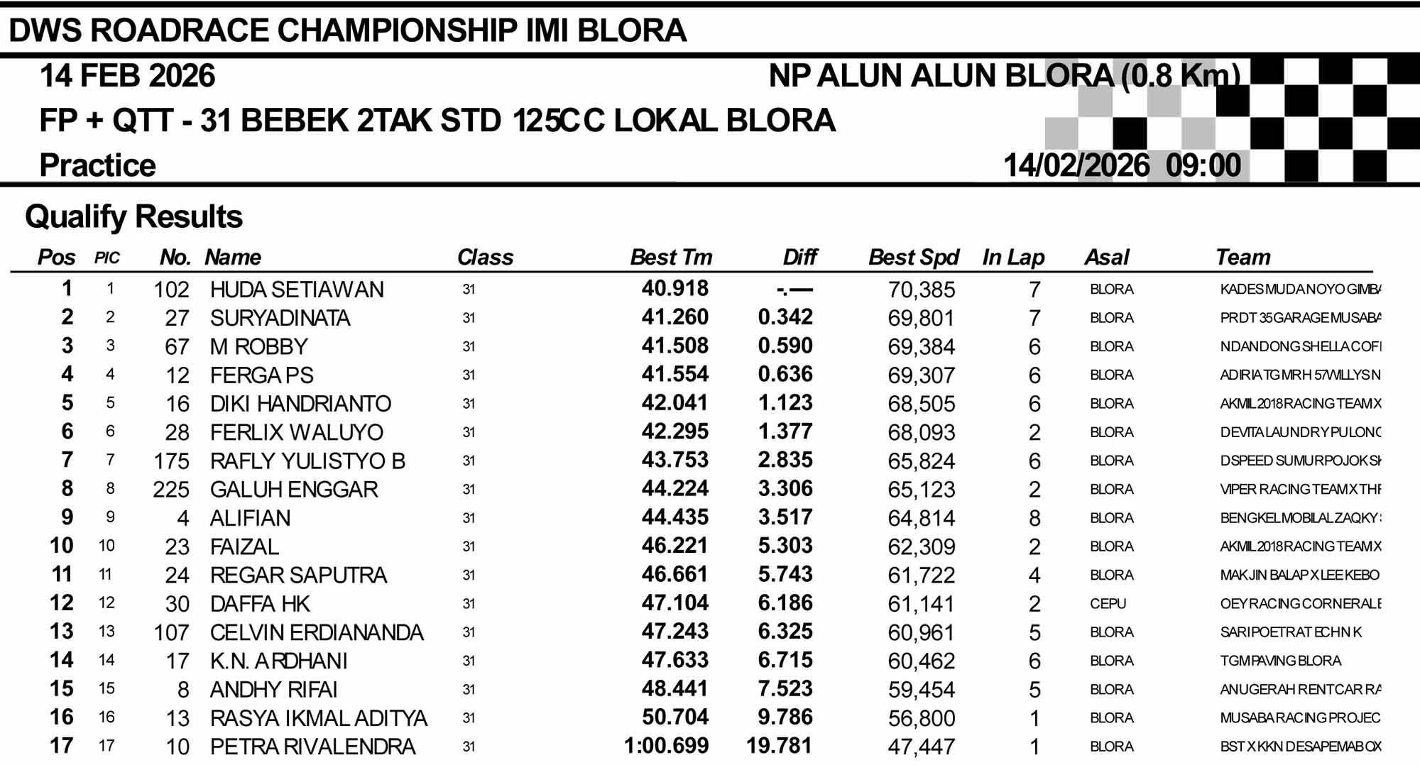 Headline Road Race 14 Februari, 2026 Hasil Kualifikasi DWS Road Race Championship 2026 Blora Posted By: BeritaBalap.com DWS Road Race Championship 2026 Blora, Hasil DWS Road Race Championship 2026 Blora, Hasil Kualifikasi DWS Road Race Championship 2026 Blora BeritaBalap.com- Berikut ini adalah hasil kualifikasi DWS Road Race Championship 2026 yang ber;angsunh dilintasan NP Alun-Alun Blora pada Sabtu, 14 Februari. R4NU
