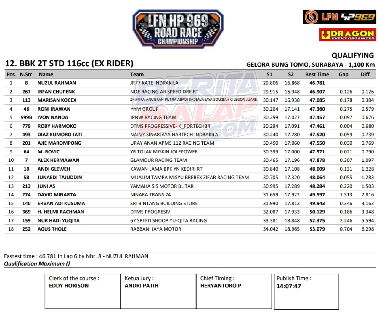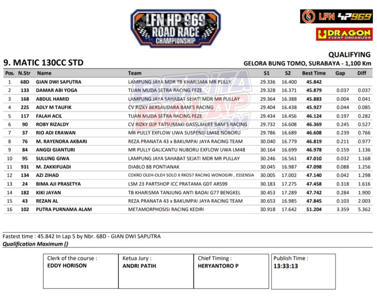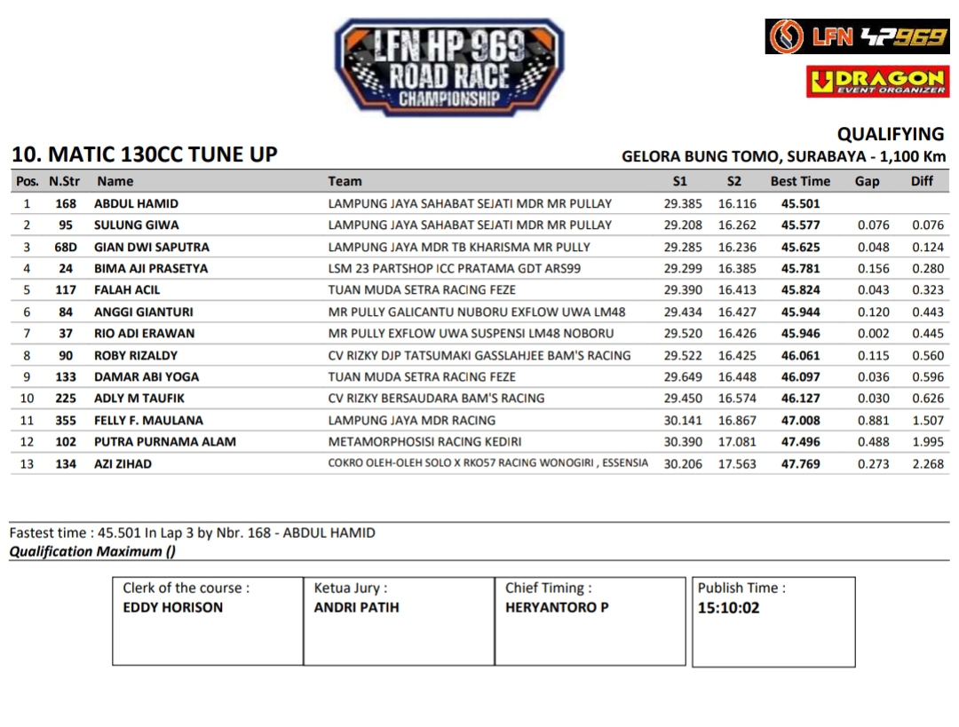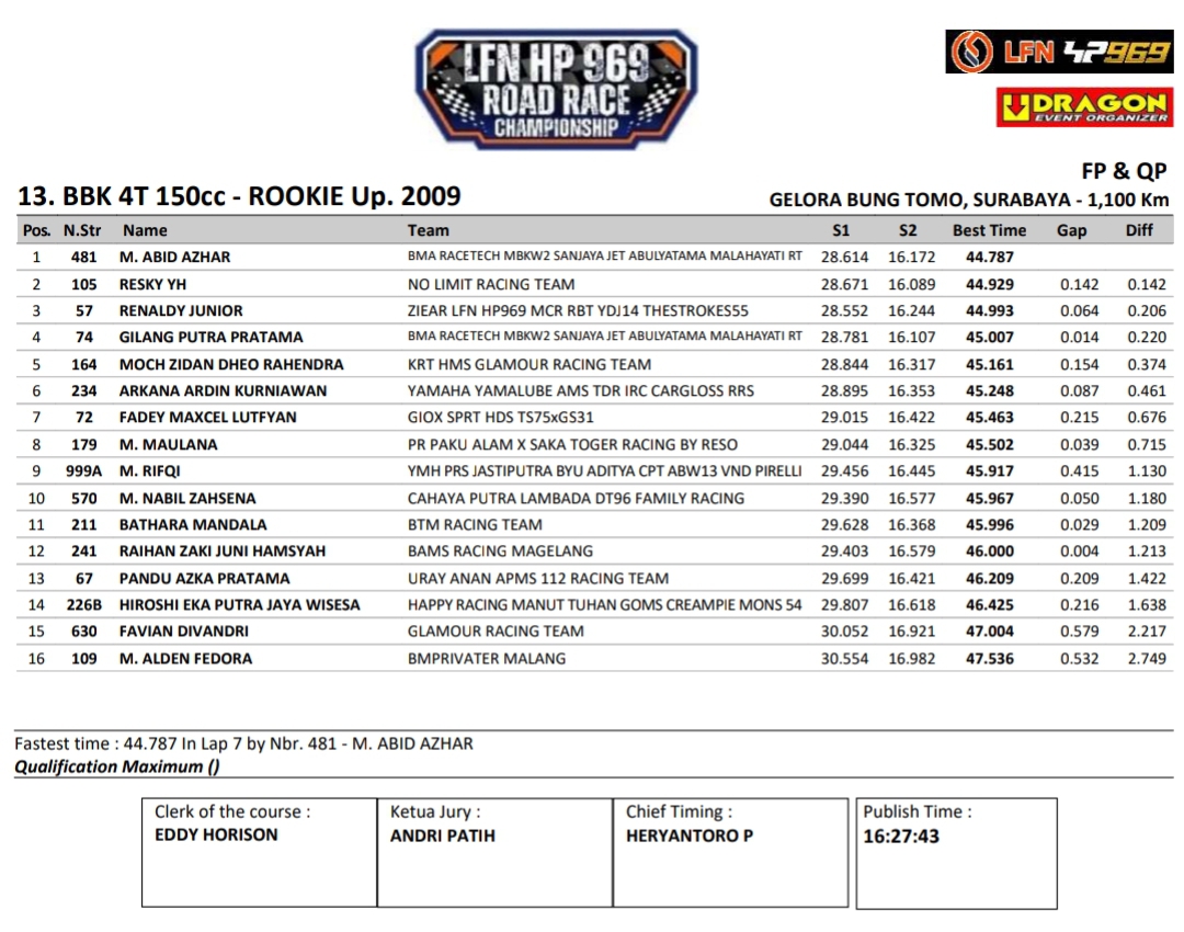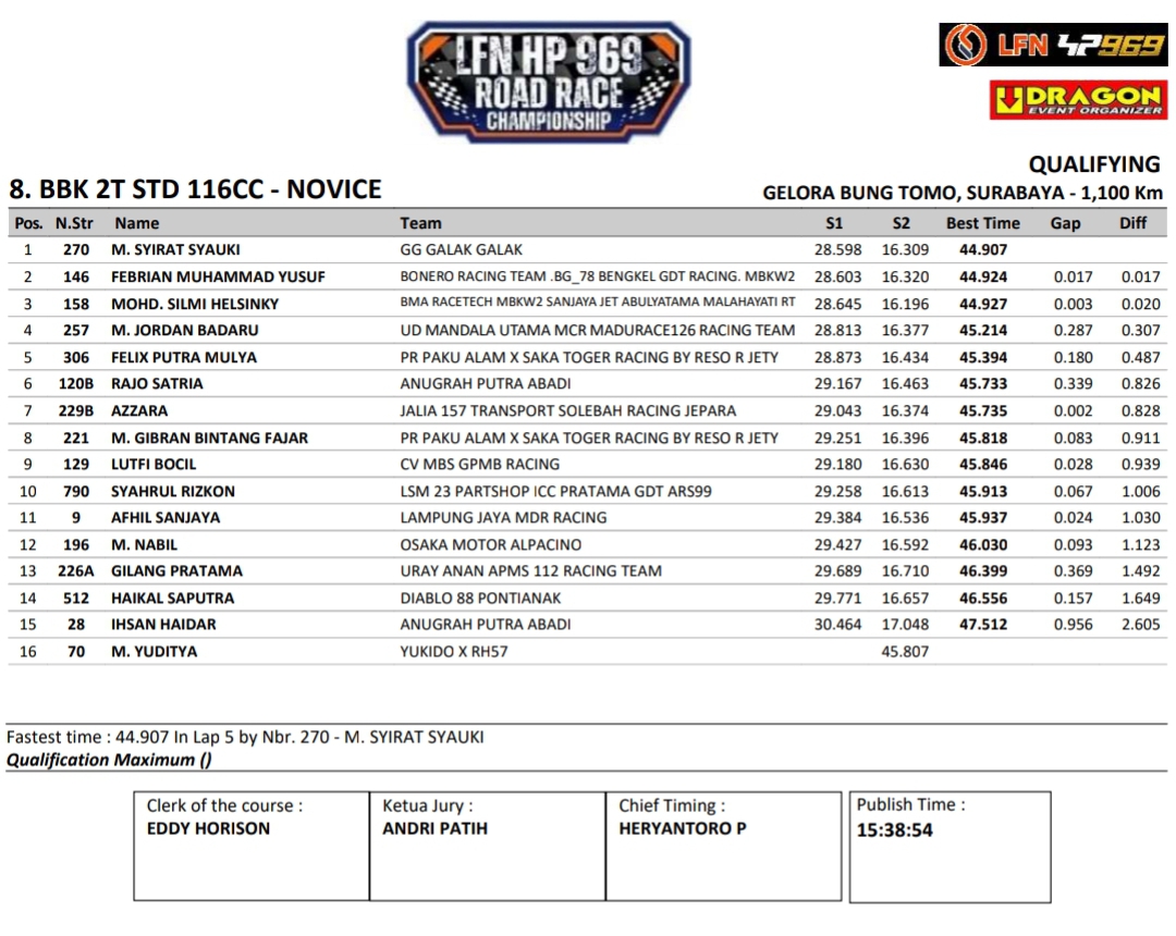Headline Road Race 8 November, 20258 November, 2025 Hasil Kualifikasi Final LFN HP969 Road Race 2025 Surabaya Posted By: BeritaBalap.com Final LFN HP969 Road Race 2025 Surabaya, Hasil Final LFN HP969 Road Race 2025, Hasil Final LFN HP969 Road Race 2025 Surabaya, Hasil Kualifikasi Final LFN HP969 Road Race 2025 Surabaya BeritaBalap.com- Berikut ini adalah hasil kualifikasi final LFN HP969 Road Race Championship 2025 yang berlangsung dilintasan GBT, Surabaya pada Sabtu, 8 November. Edhot Facebook Comments
