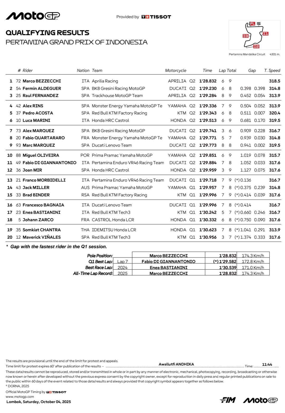 Hasil Kualifikasi MotoGP Mandalika 2025 :