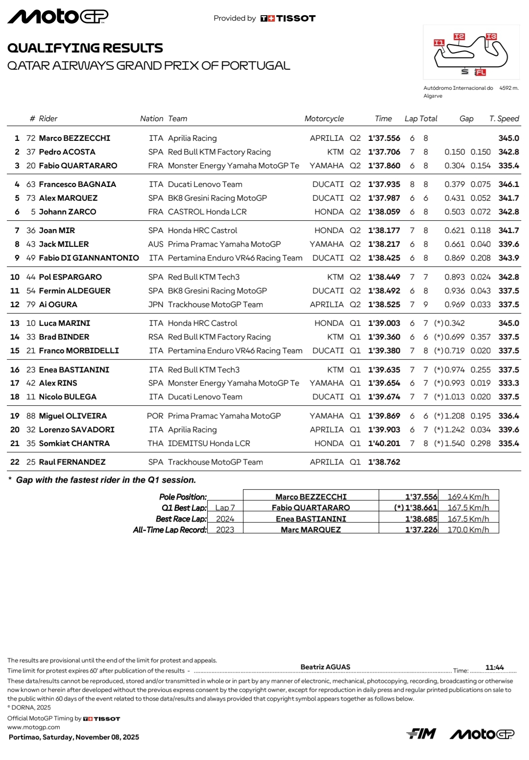 BeritaBalap.com- Berikut ini adalah hasil kualifikasi MotoGP Portugal 2025 diamana Marco Bezzecchi sukses meraih Pole Position disusul Pedro Acosta dan Fabio Quartararo. Bezzecchi berhasil mencatatkan waktu tercepat disesi kualifikasi setelah berhasil mencetak best time 1 menit 37,556 detik diatas lintasan Algarve, Portimao (8/11).