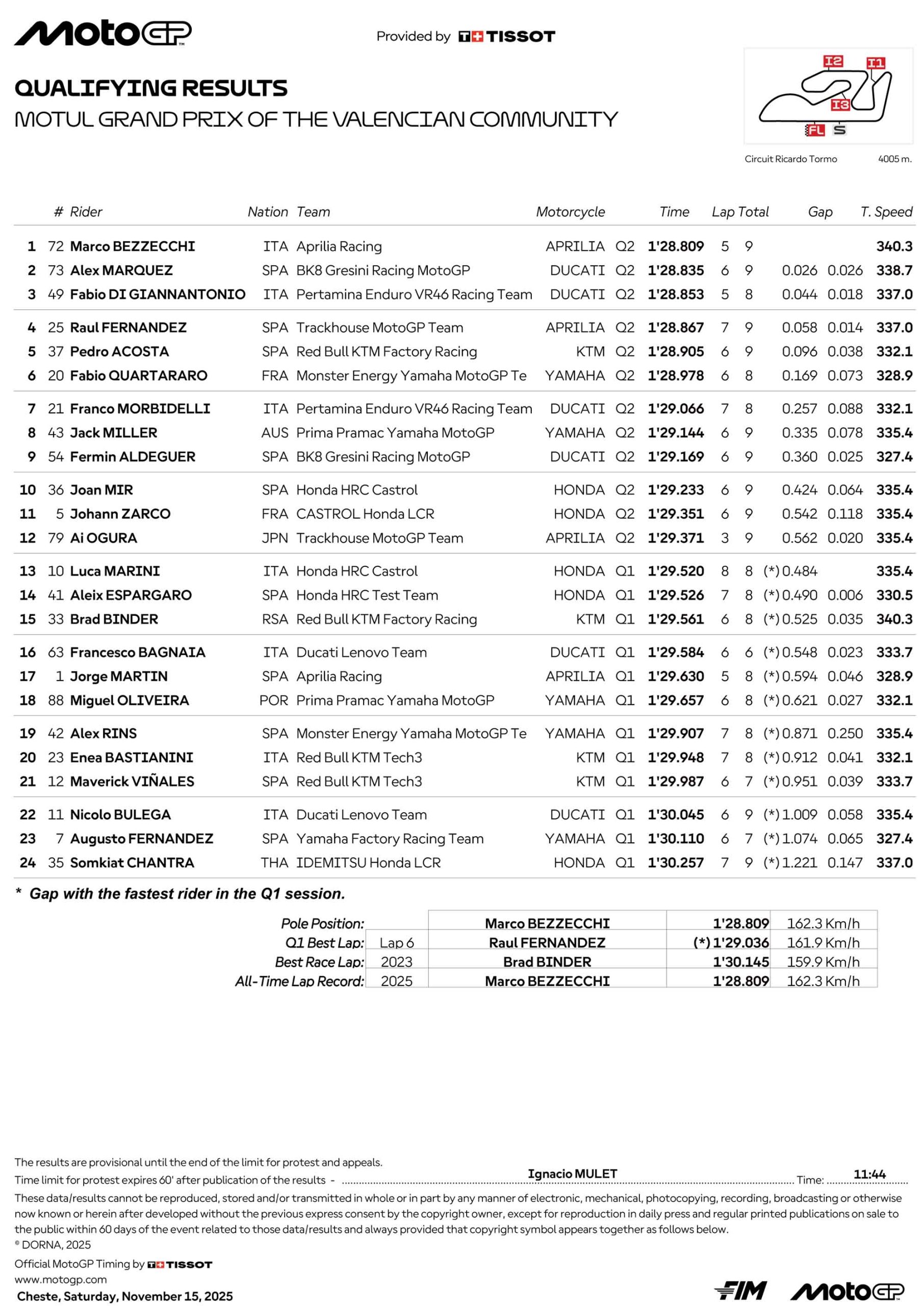 Hasil Kualifikasi MotoGP Valencia 2025 :