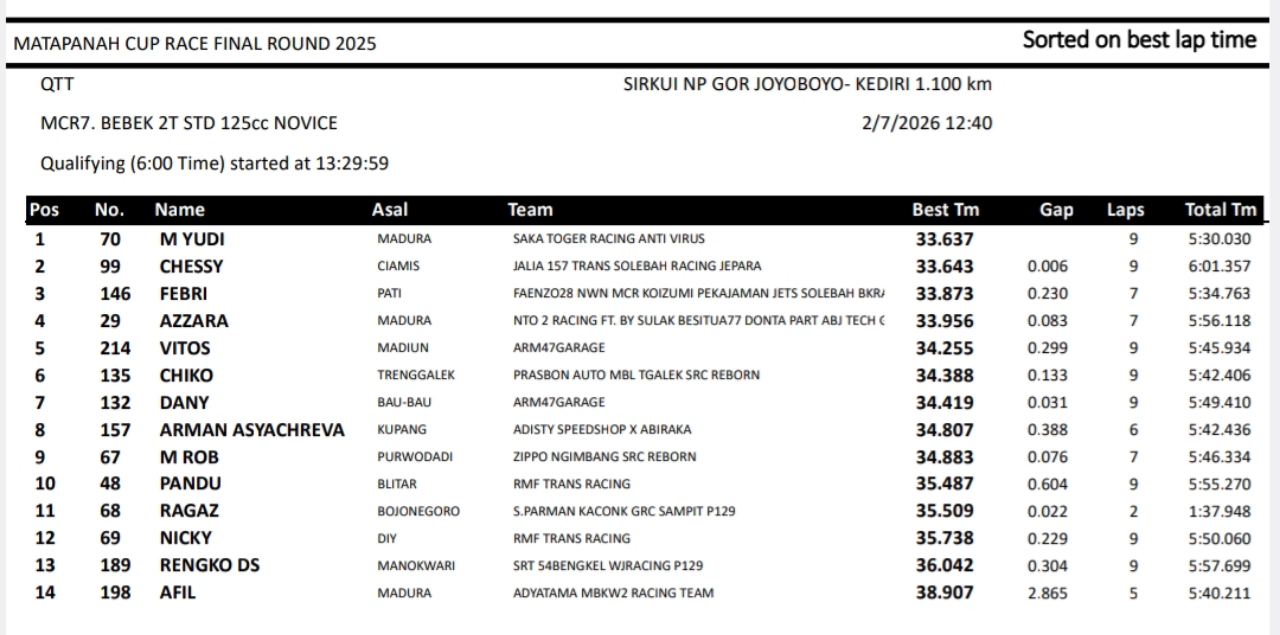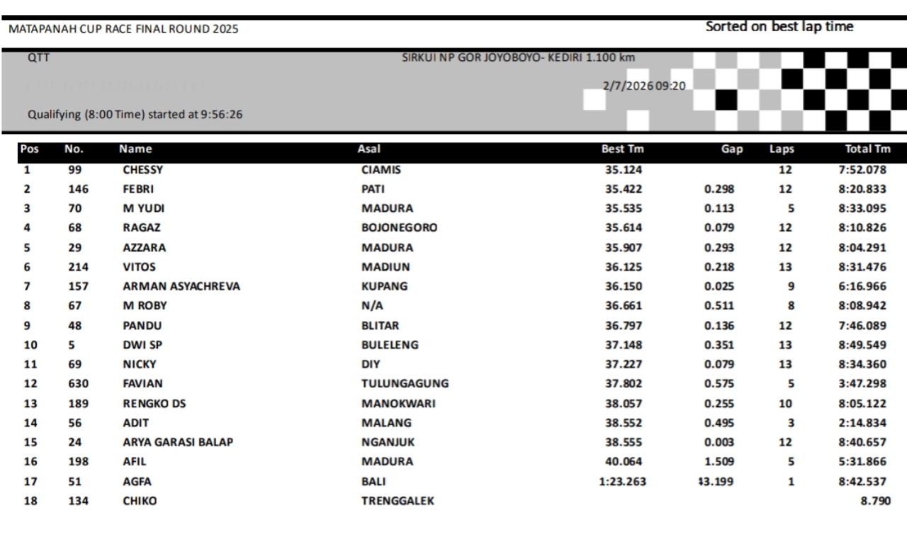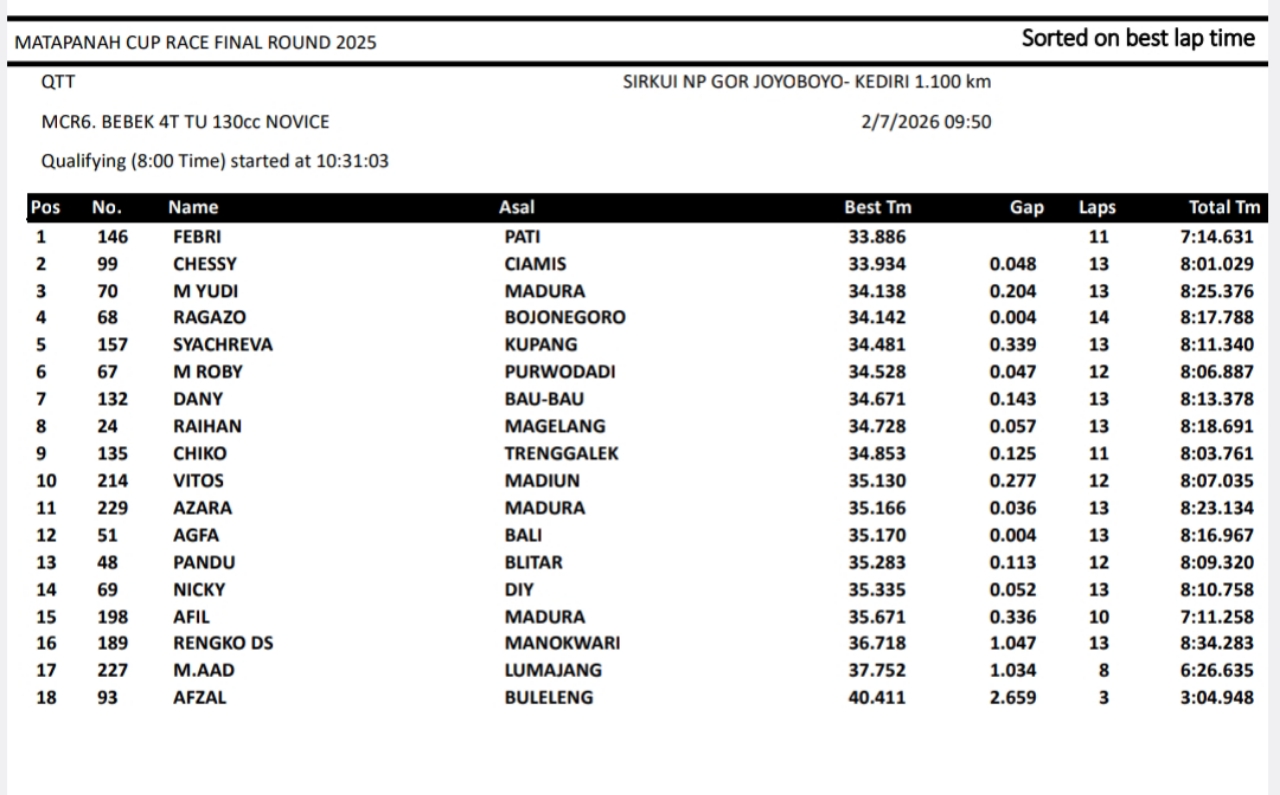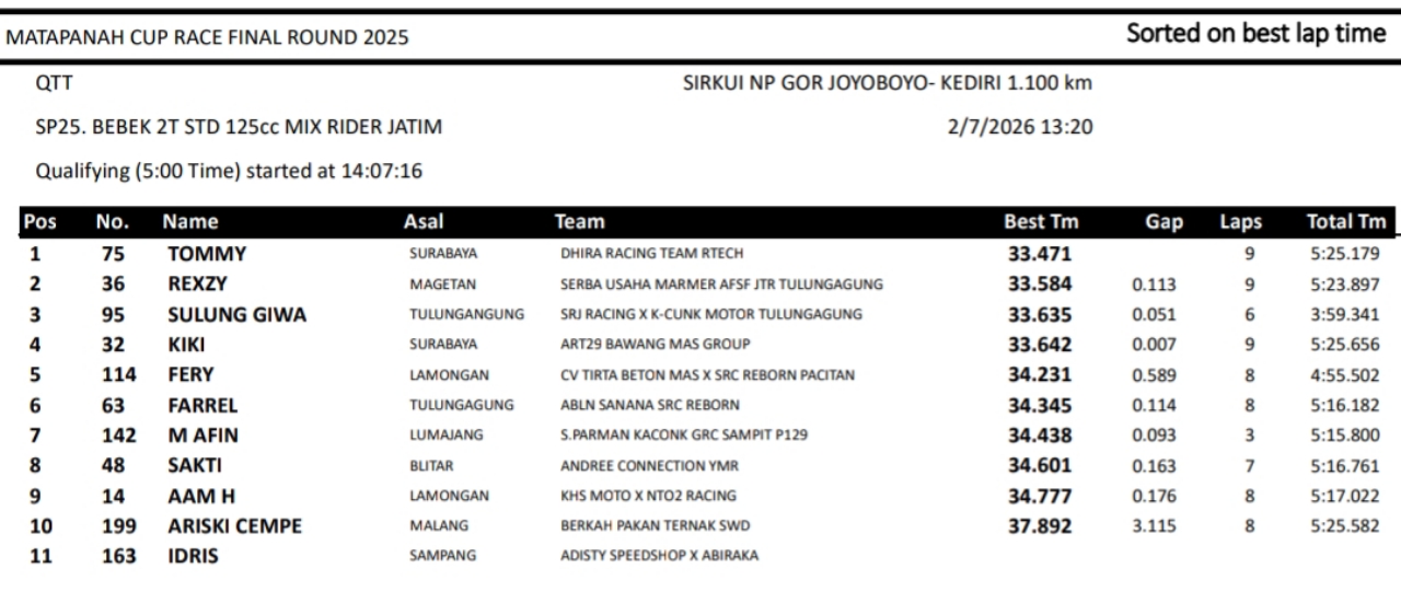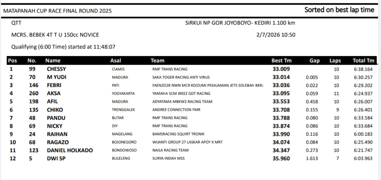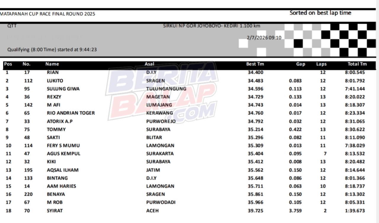 Headline Road Race 7 Februari, 2026 Hasil Kualifikasi, Race dan Sprint Race Final MCR Kediri Posted By: BeritaBalap.com Hasil Final MCR, Hasil Final MCR Kediri, Hasil Kualifikasi Race dan Sprint Race Final MCR Kediri BeritaBalap.com- Berikut ini adlah hasil kualifikasi, race dan Sprint Race final Matapanah Cup Race (MCR) 2025 yang berlangsung di sirkuit GOR Joyoboyo Kediri pada Sabtu, 7 Februari. R4NU