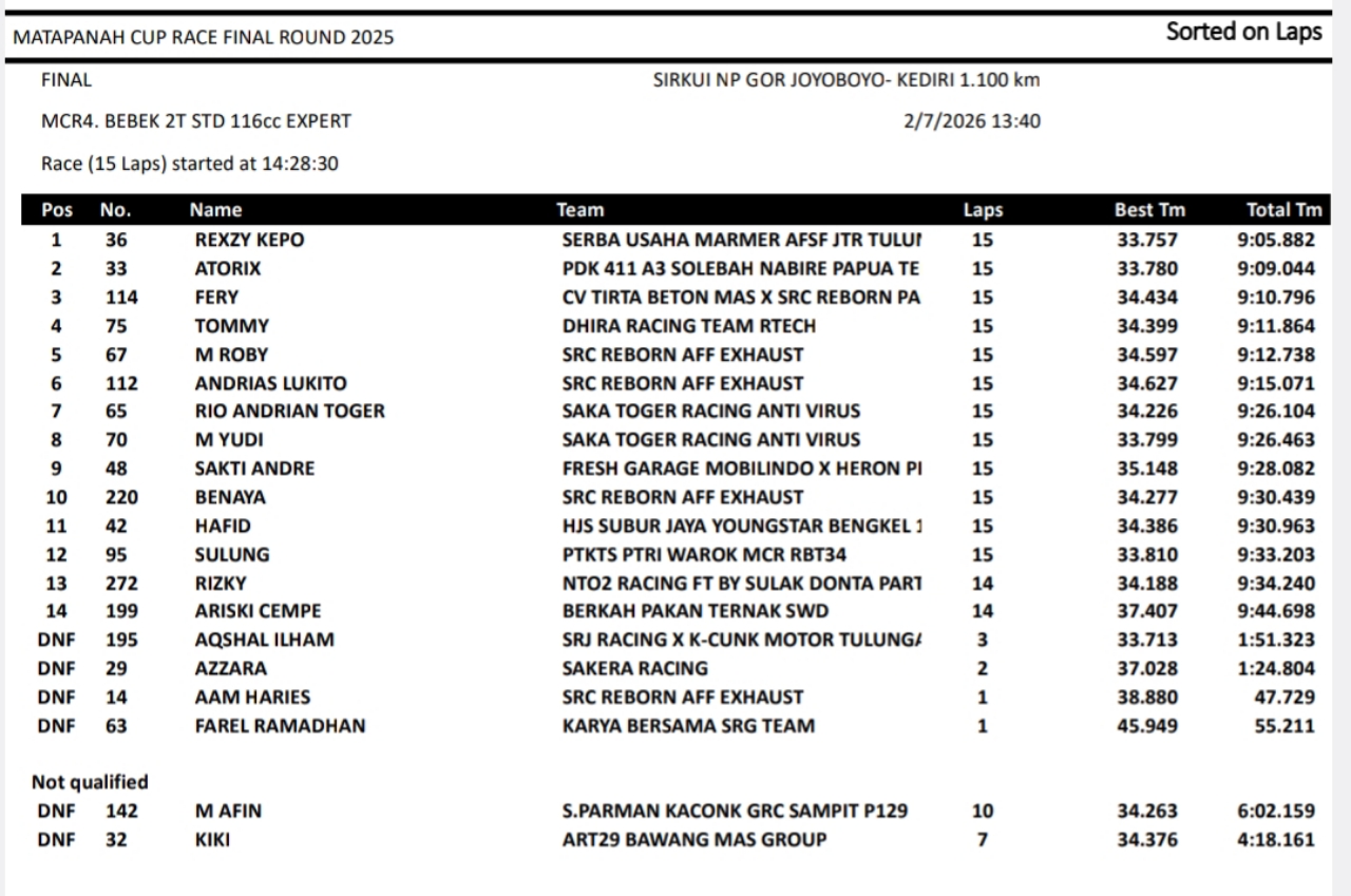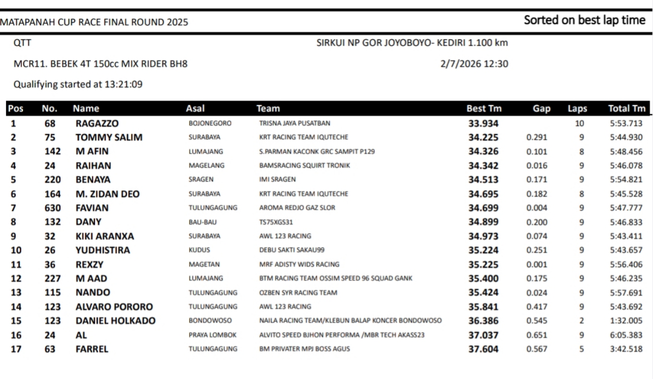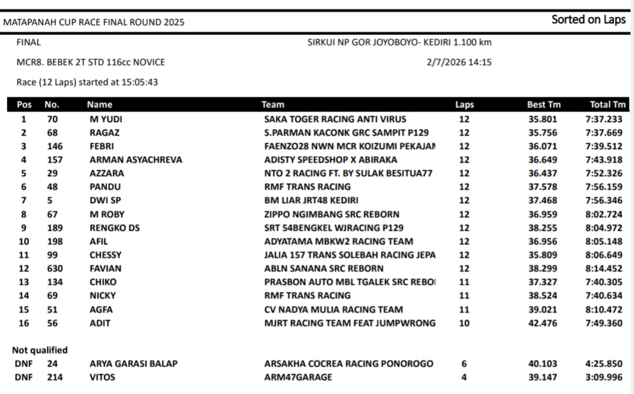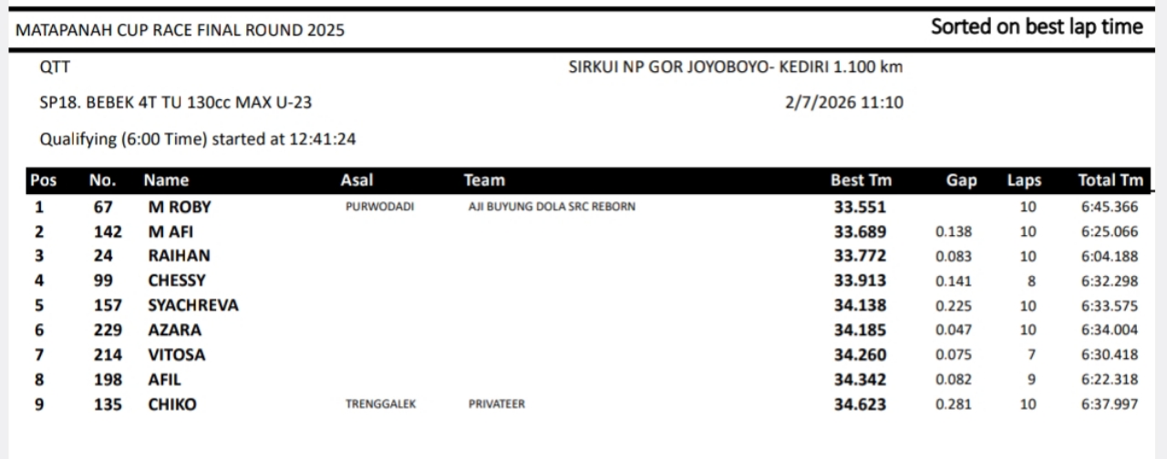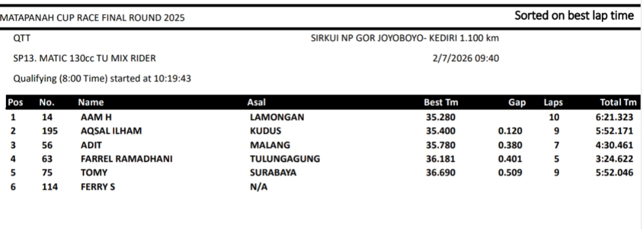 Headline Road Race 7 Februari, 2026 Hasil Kualifikasi, Race dan Sprint Race Final MCR Kediri Posted By: BeritaBalap.com Hasil Final MCR, Hasil Final MCR Kediri, Hasil Kualifikasi Race dan Sprint Race Final MCR Kediri BeritaBalap.com- Berikut ini adlah hasil kualifikasi, race dan Sprint Race final Matapanah Cup Race (MCR) 2025 yang berlangsung di sirkuit GOR Joyoboyo Kediri pada Sabtu, 7 Februari. R4NU