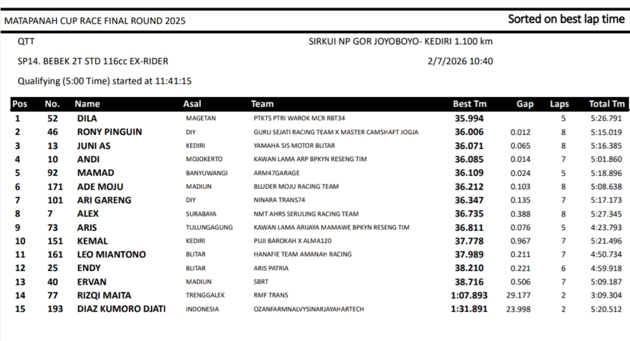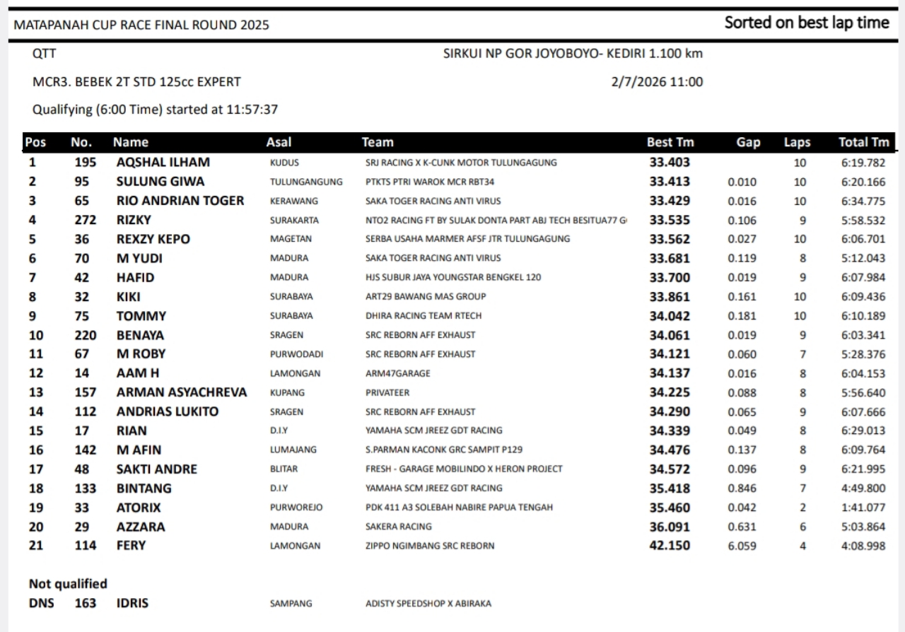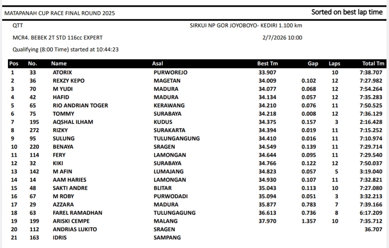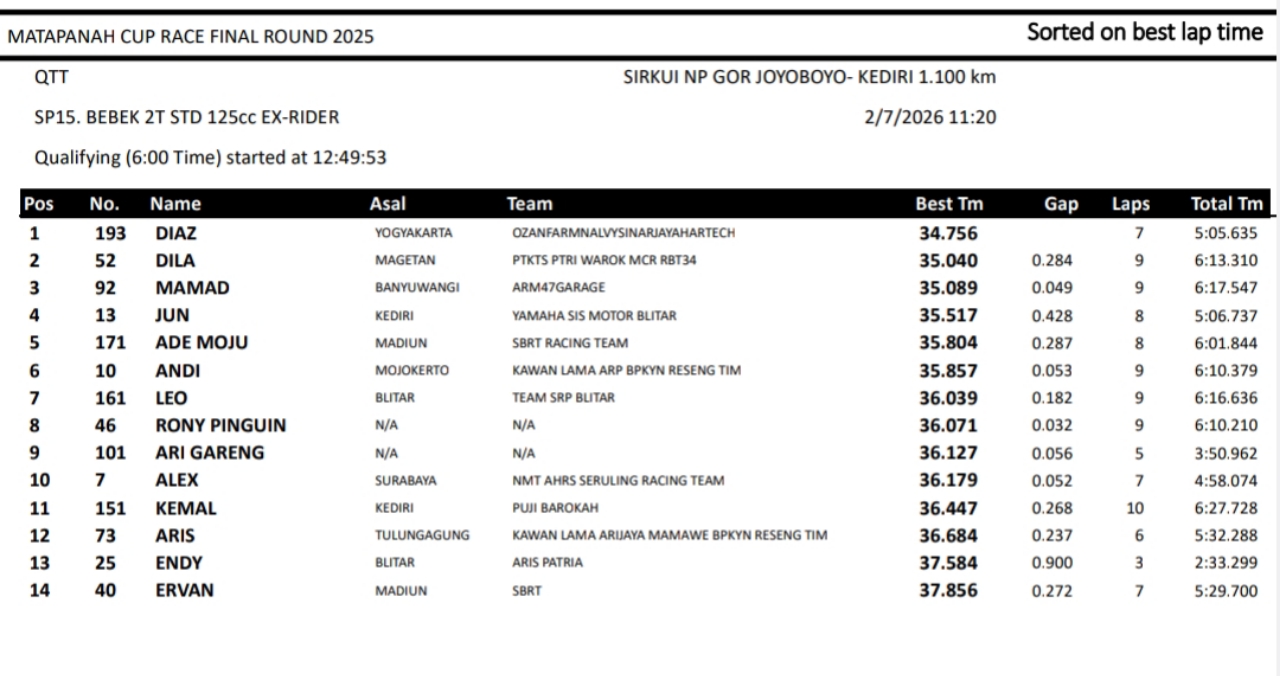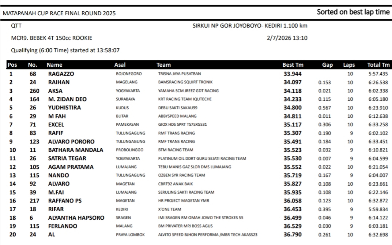 Headline Road Race 7 Februari, 2026 Hasil Kualifikasi, Race dan Sprint Race Final MCR Kediri Posted By: BeritaBalap.com Hasil Final MCR, Hasil Final MCR Kediri, Hasil Kualifikasi Race dan Sprint Race Final MCR Kediri BeritaBalap.com- Berikut ini adlah hasil kualifikasi, race dan Sprint Race final Matapanah Cup Race (MCR) 2025 yang berlangsung di sirkuit GOR Joyoboyo Kediri pada Sabtu, 7 Februari. R4NU