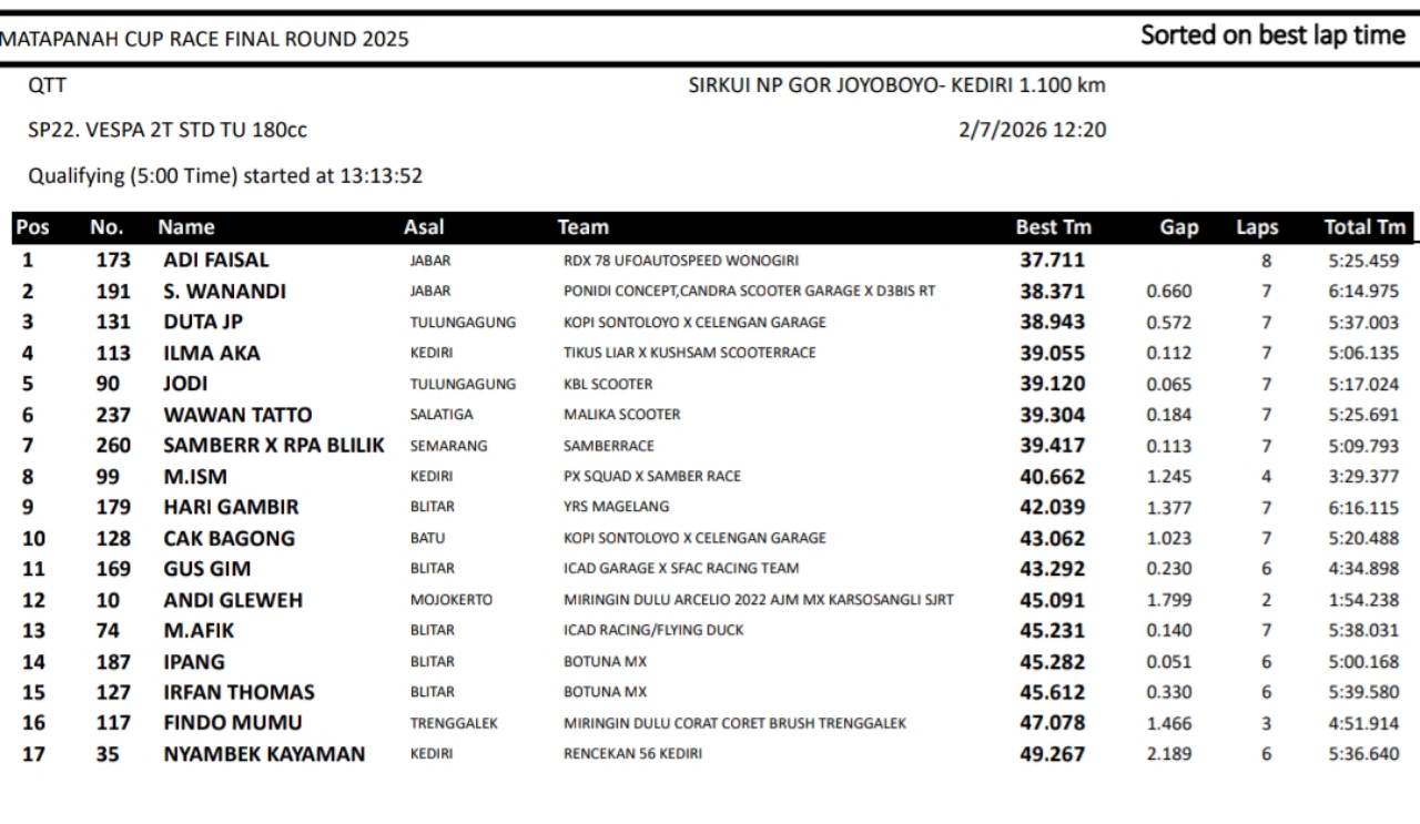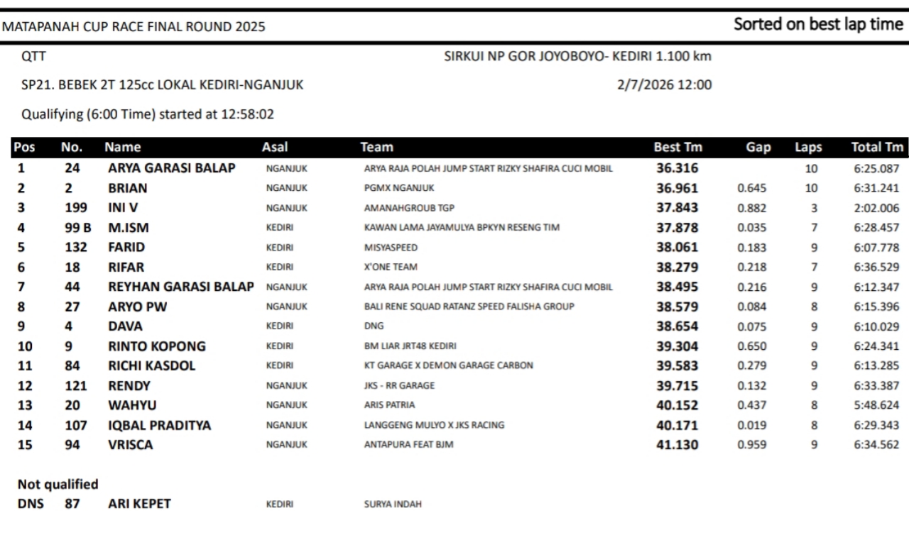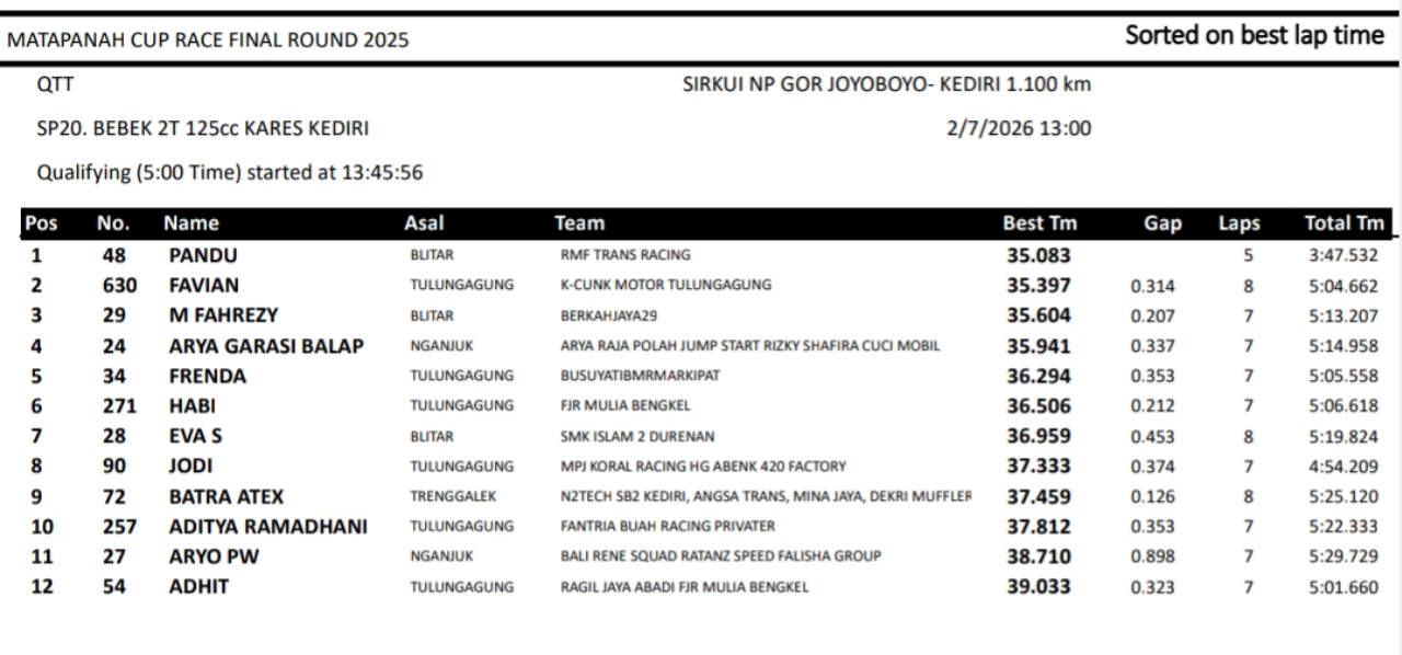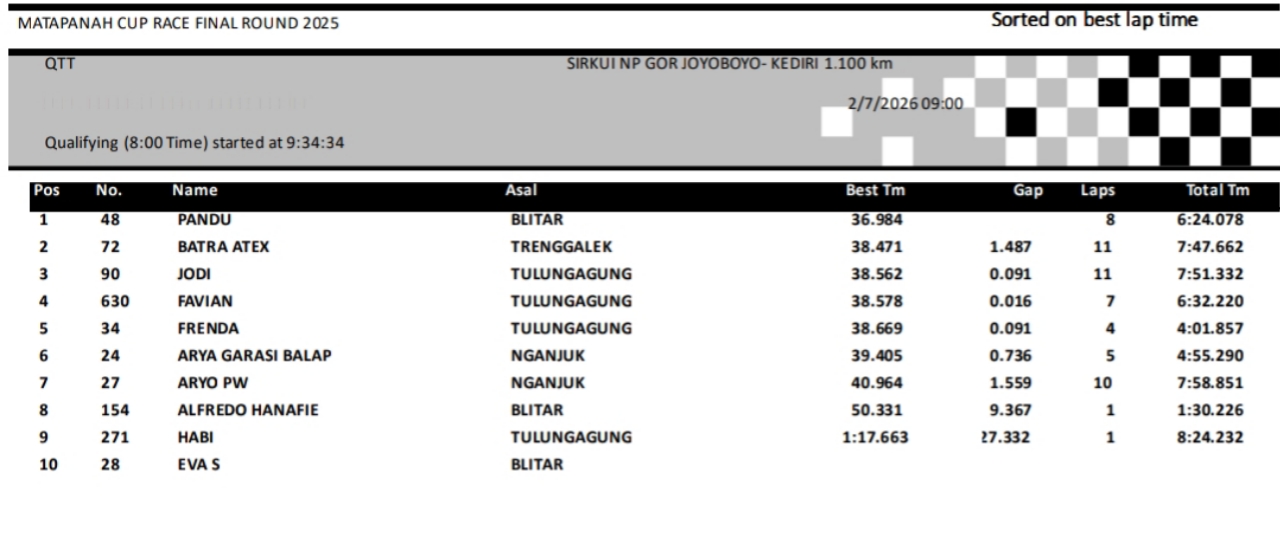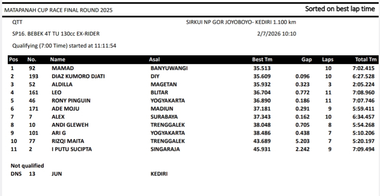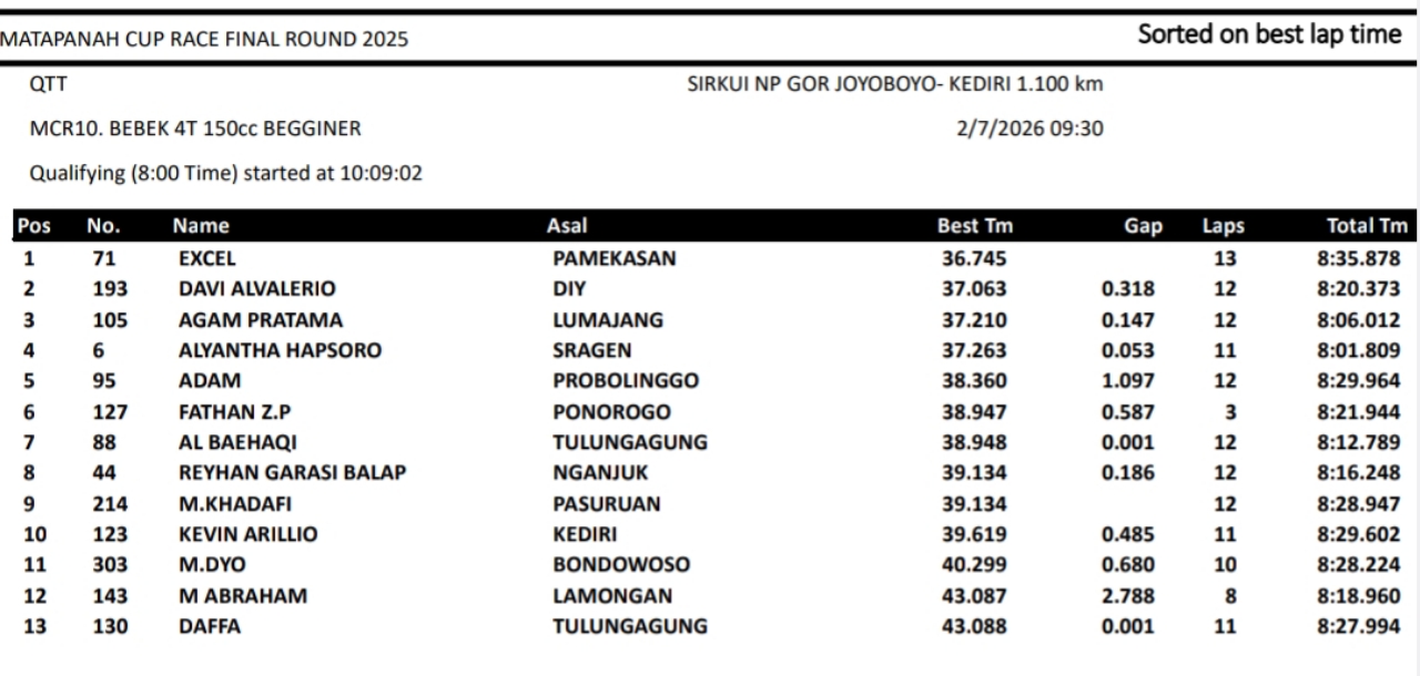 Headline Road Race 7 Februari, 2026 Hasil Kualifikasi, Race dan Sprint Race Final MCR Kediri Posted By: BeritaBalap.com Hasil Final MCR, Hasil Final MCR Kediri, Hasil Kualifikasi Race dan Sprint Race Final MCR Kediri BeritaBalap.com- Berikut ini adlah hasil kualifikasi, race dan Sprint Race final Matapanah Cup Race (MCR) 2025 yang berlangsung di sirkuit GOR Joyoboyo Kediri pada Sabtu, 7 Februari. R4NU