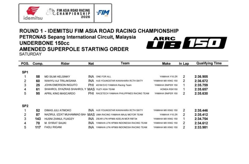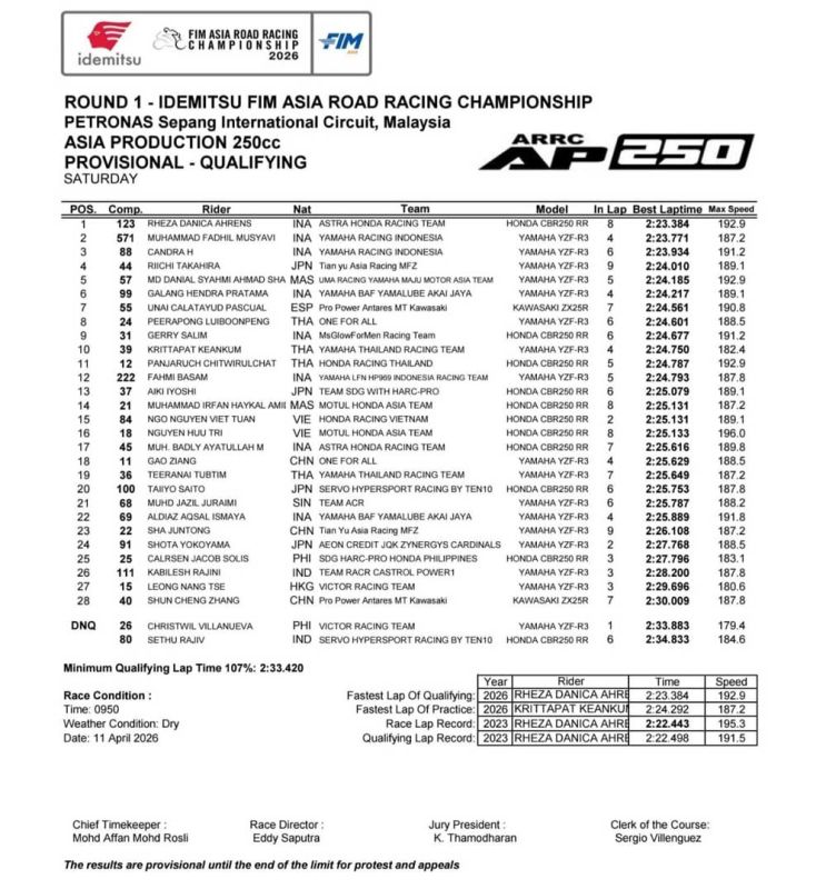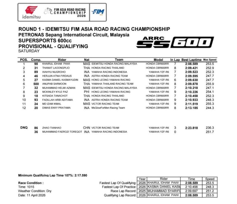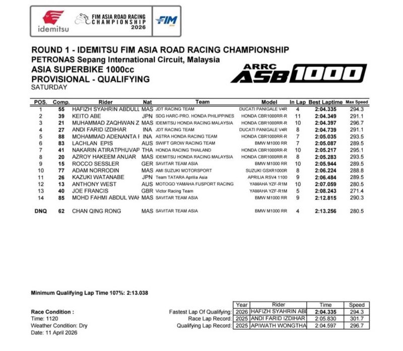 ARRC Headline Road Race 11 April, 202611 April, 2026 Hasil Lengkap Kualifikasi ARRC 2026 Sepang Malaysia Posted By: BeritaBalap.com Hasil ARRC 2026 Sepang Malaysia, Hasil Lengkap Kualifikasi ARRC 2026 Sepang Malaysia BeritaBalap.com- Berikut ini adalah hasil lengkap kualifikasi Asia Road Racing Championship 2026 seri perdana yang berlangsung disirkuit Sepang, Malaysia pada Sabtu, 11 April. BB1