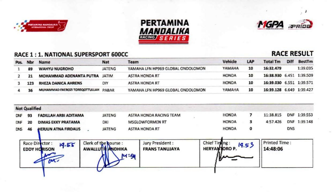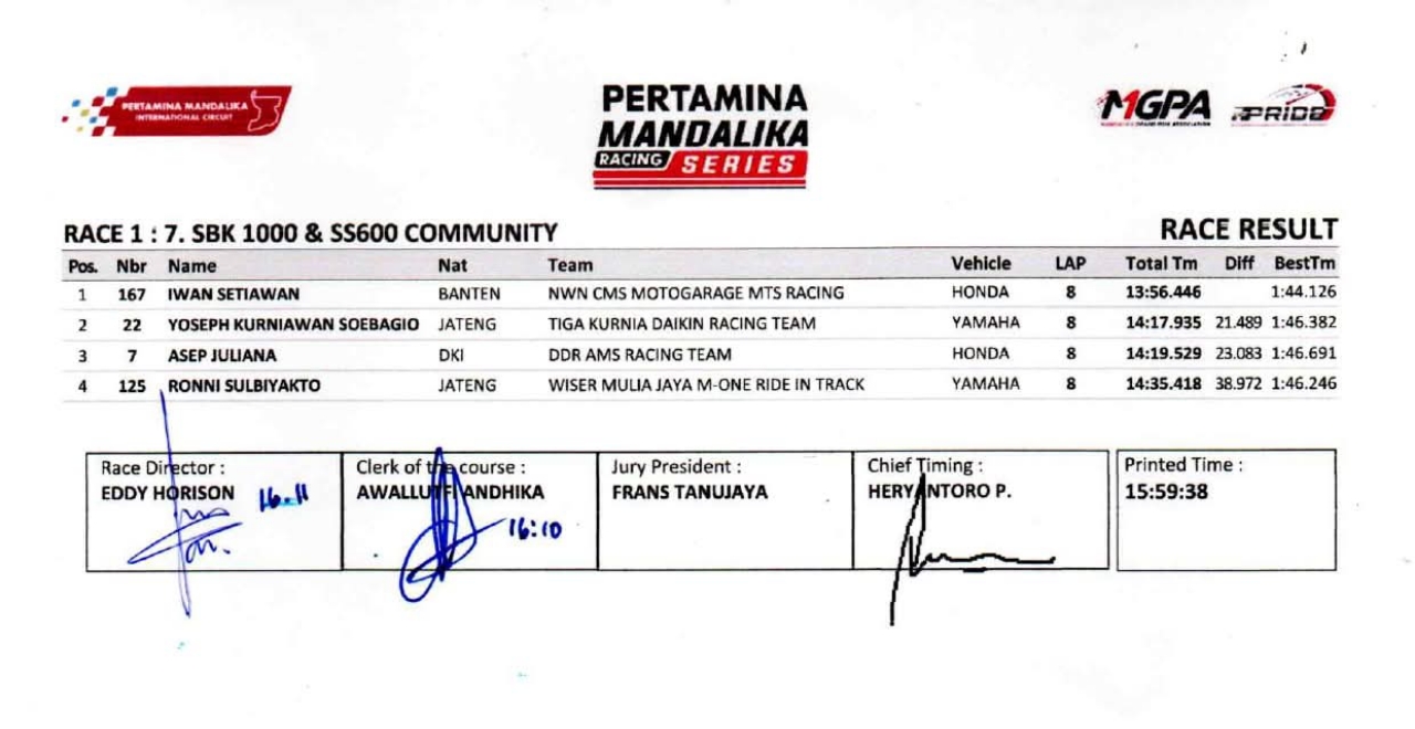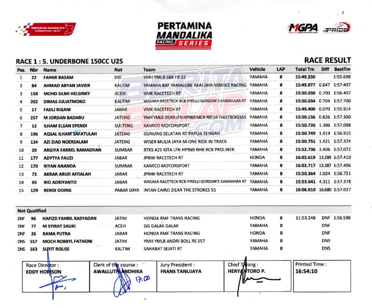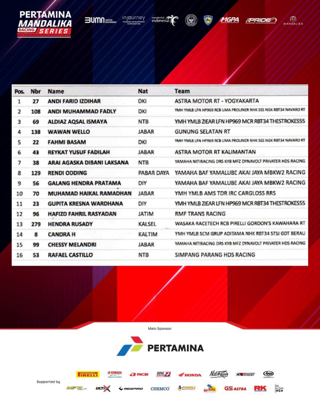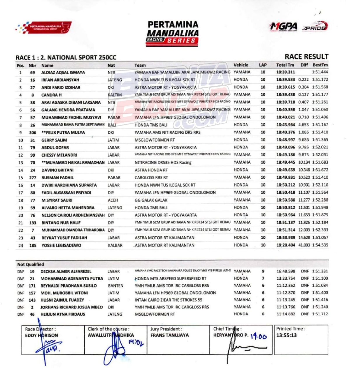 BeritaBalap.com- Berikut ini adalah hasil race 1 Final Kejurnas Mandalika Racing Series (MRS) 2025 yang berlangsung dilintasan Pertamina Mandalika International Circuit, Lombok, Nusa Tenggara Barat pada Sabtu, 1 November. BB1
