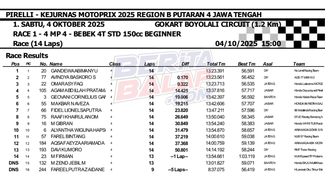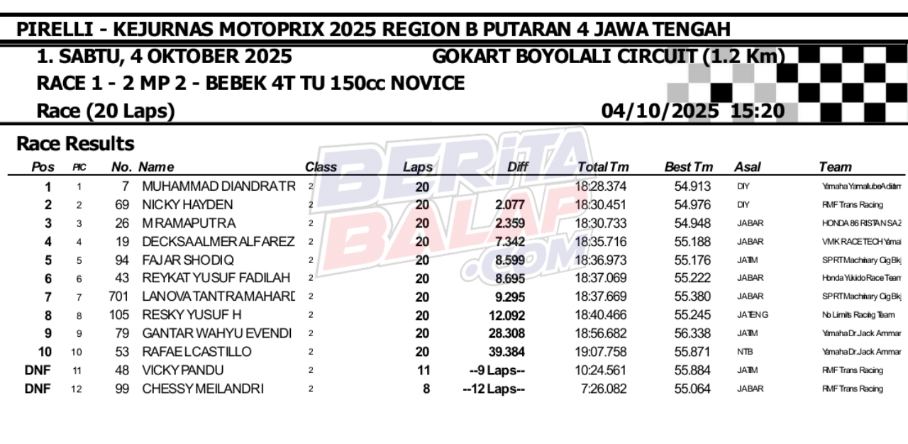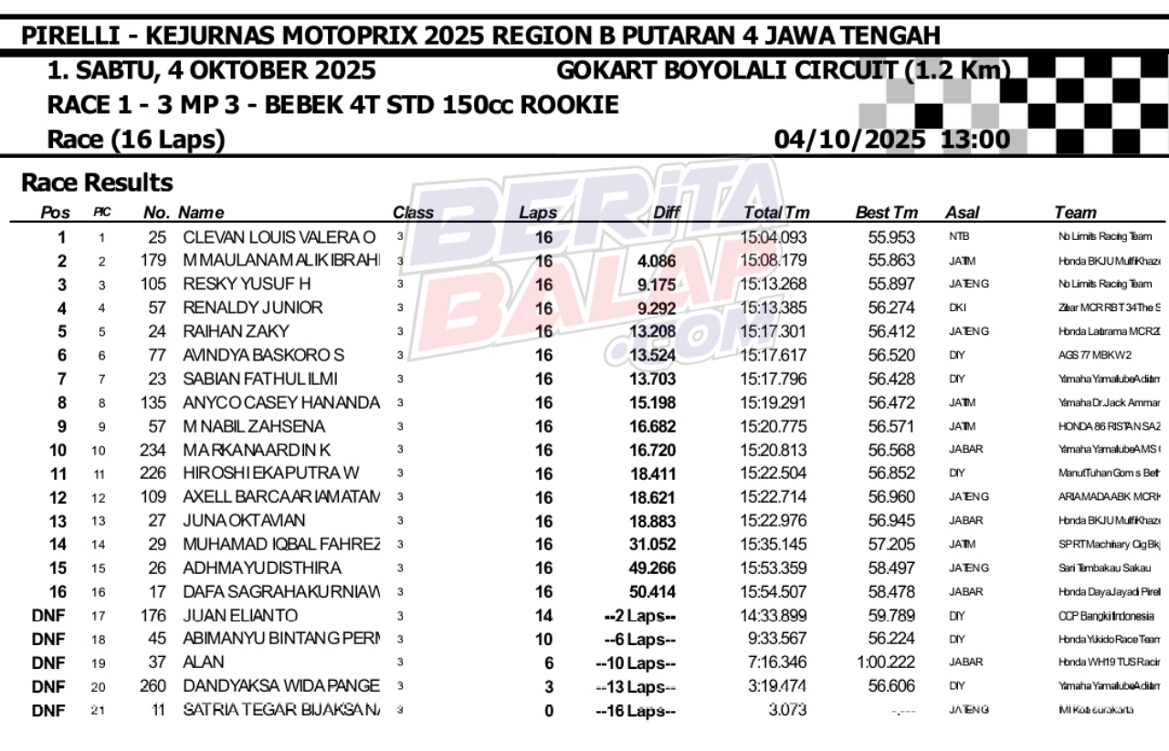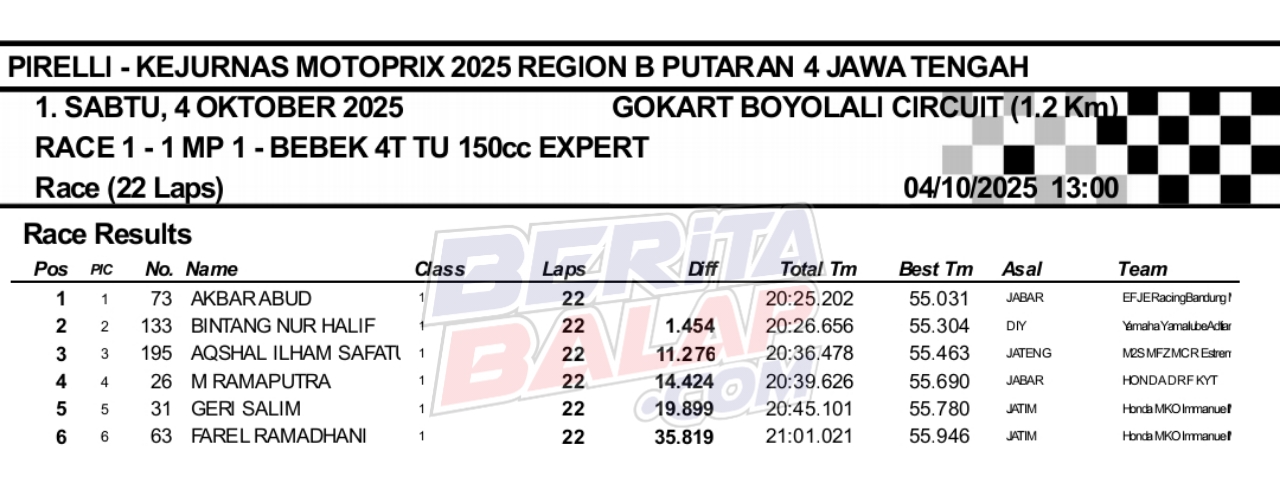 Headline Road Race 4 Oktober, 20254 Oktober, 2025 Hasil Race 1 Final Motoprix 2025 Boyolali Posted By: BeritaBalap.com Final Motoprix 2025 Boyolali, Hasil Final Motoprix 2025 Boyolali, Hasil Race 1 Final Motoprix 2025 Boyolali BeritaBalap.com- Berikut ini adalah hasil race 1 final Kejurnas Motoprix 2025 region B (Jawa, Bali & Nusa Tenggara) yang berlangsung dilintasan Gokart, Boyolali, Jateng (4/10). BB1 / Edhot / R4NU Facebook Comments
