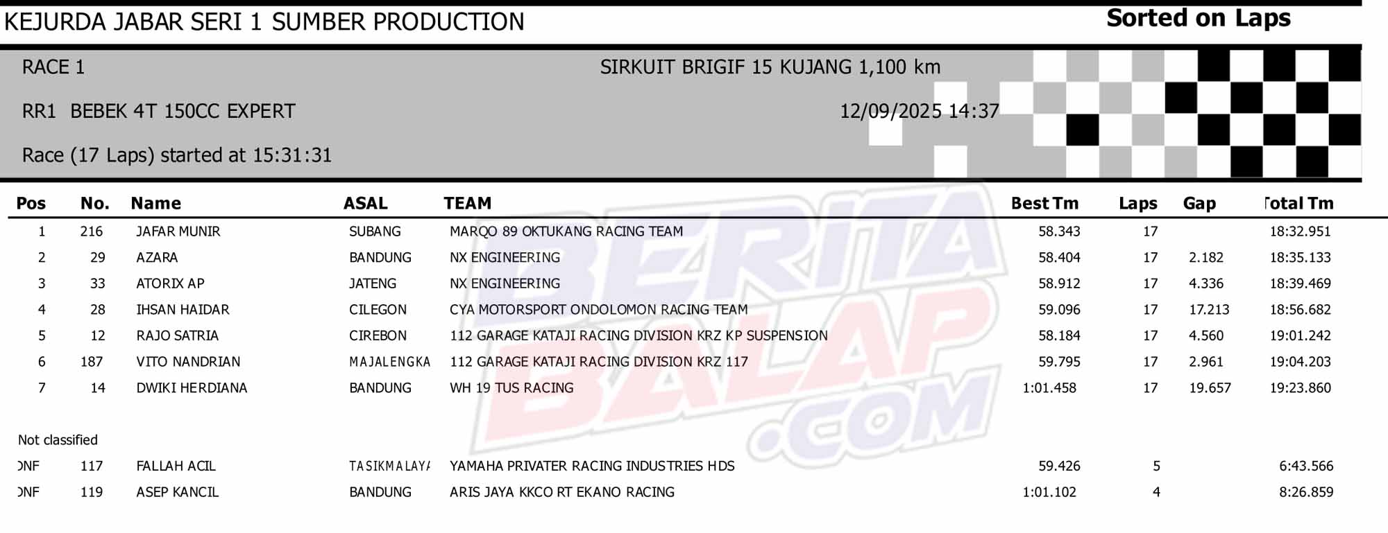 Headline Road Race 12 September, 2025 Hasil Race 1 Kejurda Road Race Jabar 2025 Round 1 Posted By: BeritaBalap.com Hasil Kejurda Road Race Jabar 2025, Hasil Race 1 Kejurda Road Race Jabar 2025, Hasil Race 1 Kejurda Road Race Jabar 2025 Round 1 BeritaBalap.com- Berikut ini adalah hasil race 1 Kejurda Road Race Jabar 2025 round 1 yang berlangsung dilintasan Brigif 15 Kujang II, Cimahi pada Jum’at, 12 September. Edhot Facebook Comments
