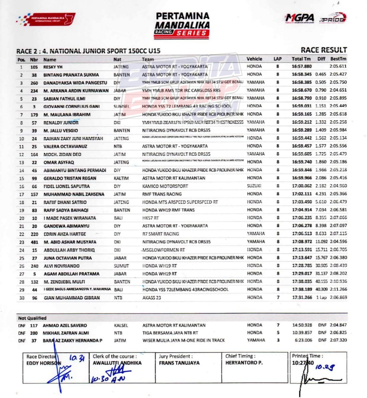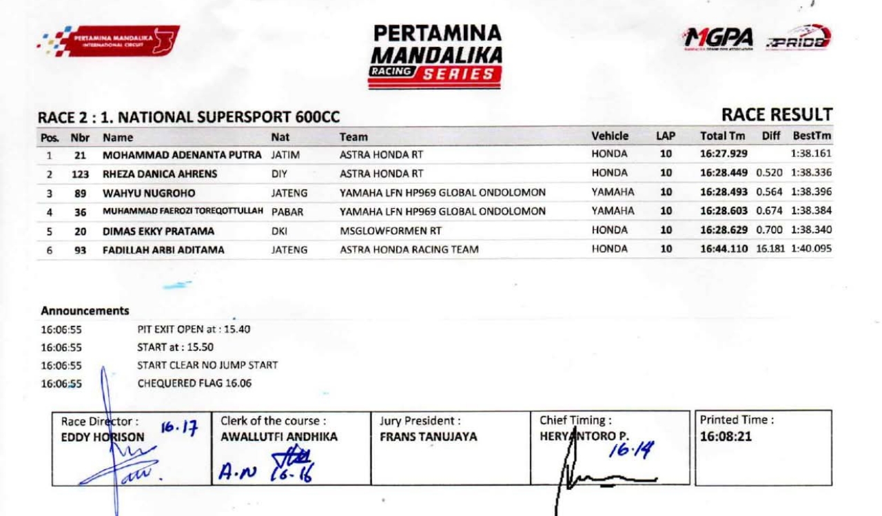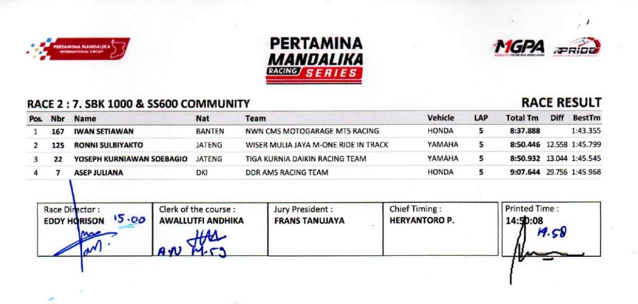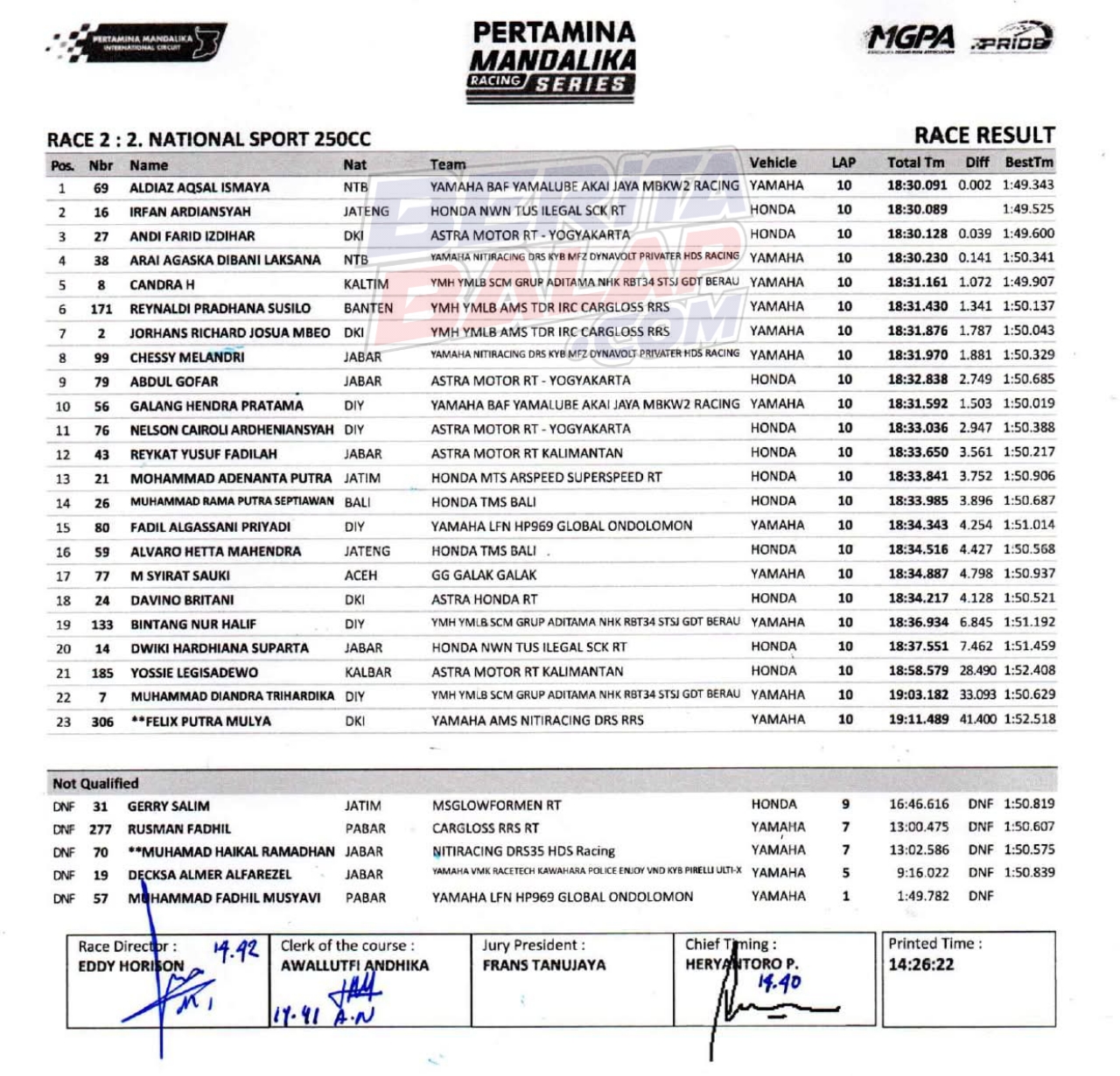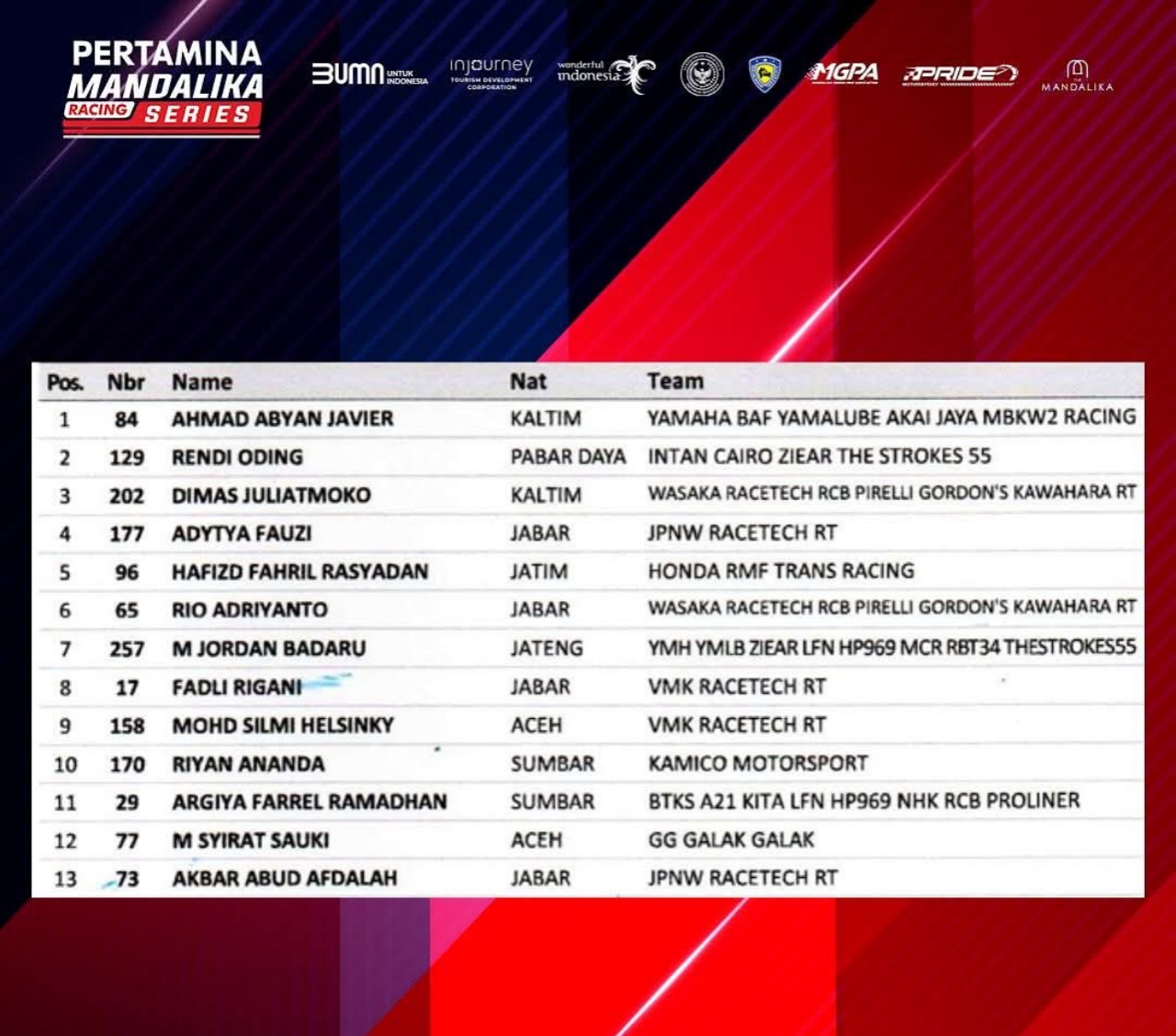 BeritaBalap.com- Berikut ini adalah hasil race 2 Final Kejurnas Mandalika Racing Series (MRS) 2025 yang berlangsung dilintasan Pertamina Mandalika International Circuit, Lombok, Nusa Tenggara Barat pada Minggu, 2 November. BB1