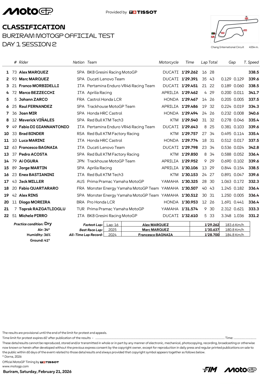 BeritaBalap.com- Berikut ini adalah hasil tes pramusim MotoGP 2026 Thailand hari pertama yang berlangsung disirkuit Buriram pada Sabtu, 21 Februari. Alex Marquez menyelesaikan sesi sebagai yang tercepat dan dibayang-bayangi oleh Marc Marquez.