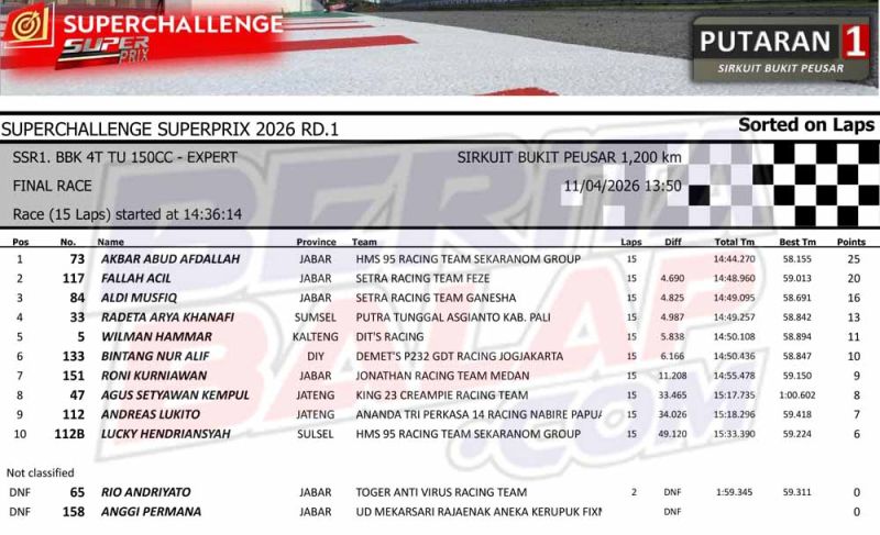 BeritaBalap.com- Tim asal pualu garam HMS95 menjadikan Akbar Abud superior dikelas Expert (Bebek 4T TU 150cc) gelaran Superchallenge Superprix 2026 Tasikmalaya. Ini merupakan seri pembuka yang berlangsung dilintasan Bukit Peusar, Tasikmlaya (12/4).