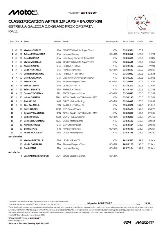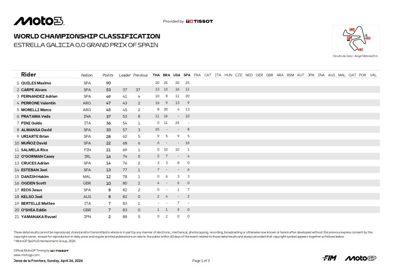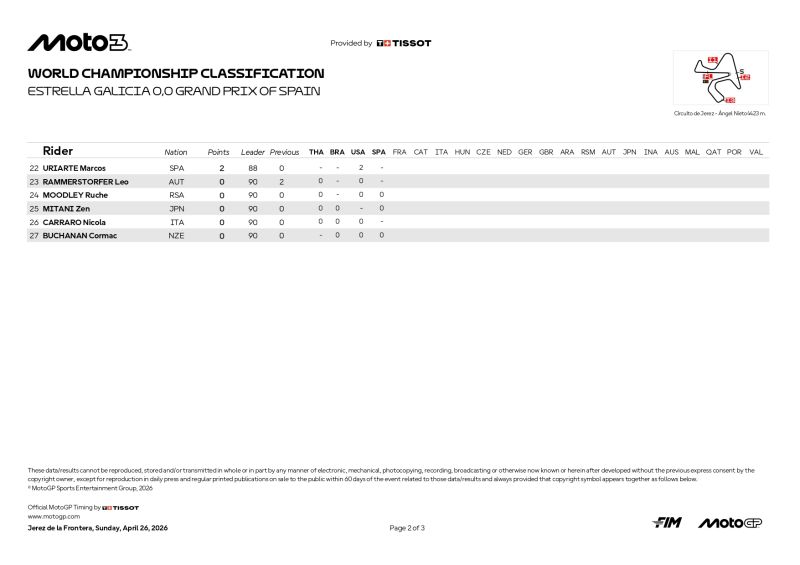 Pada akhirnya, posisi Veda Ega Pratama dalam klasemen sementara Moto3 hingga putaran Jerez Spanyol naik ke peringkat 6. Sebelumnya pasca seri Austin USA dimana ia mengalami crash berada di deretan ke-7. Jadi ada peningkatan. BB1