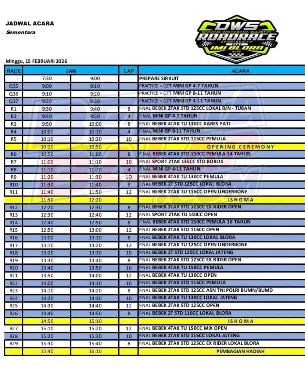 Hajat balap ini mendapat support penuh dari H. Danang W.S salah satu anggota DPR RI dari fraksi Gerinda yang tentunya telah mendapat restu dari Adiria, selaku ketua IMI Blora. Sehubungan dengan jadual balap event DWS Road Race 2026 Blora, mari kita beberkan rinciannya.