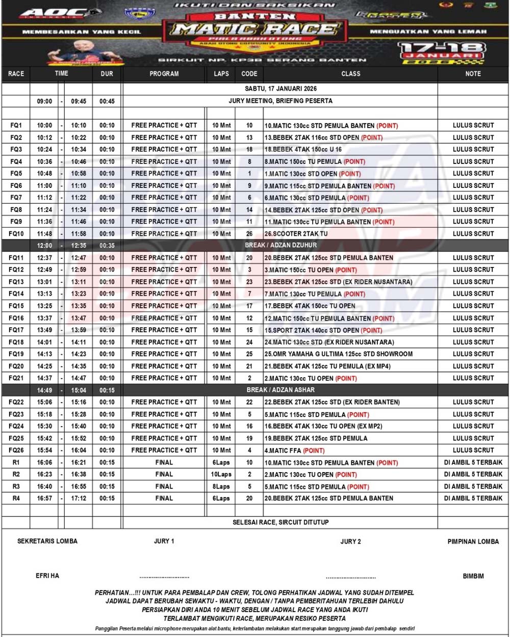 Untuk Sabtu, 17 Januari 2026 akan dibuka dengan sesi latihan bebas sekaligus melangsungkan babak kualifikasi. Catat baik-baik ya gaes, setelahnya (masih dihari yang sama) bakal melangsungkan beberapa final race untuk beberapa kelas.