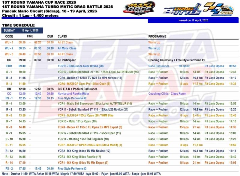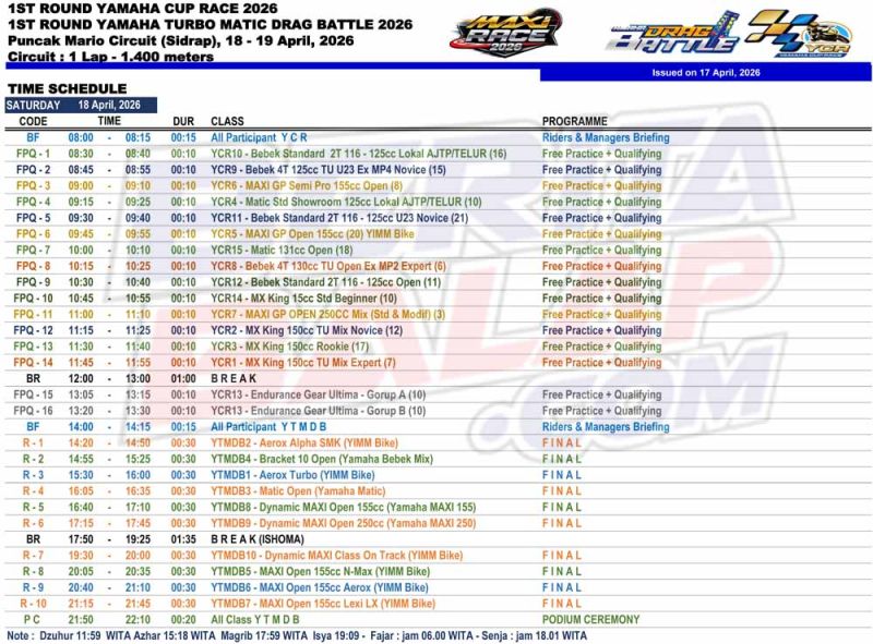 Headline Road Race 18 April, 2026 Jadwal Balap Seri Pembuka Yamaha Cup Race 2026 Sidrap Posted By: BeritaBalap.com Jadwal Balap Seri Pembuka Yamaha Cup Race 2026 Sidrap, Jadwal Yamaha Cup Race 2026, Jadwal Yamaha Cup Race 2026 Sidrap, Yamaha Cup Race 2026, Yamaha Cup Race 2026 Sidrap BeritaBalap.com- Berikut ini adalah jadwal balap seri pembuka Yamaha Cup Race 2026 yang berlangsung di Puncak Mario Circuit, Sidrap pada 18-19 April. BB1