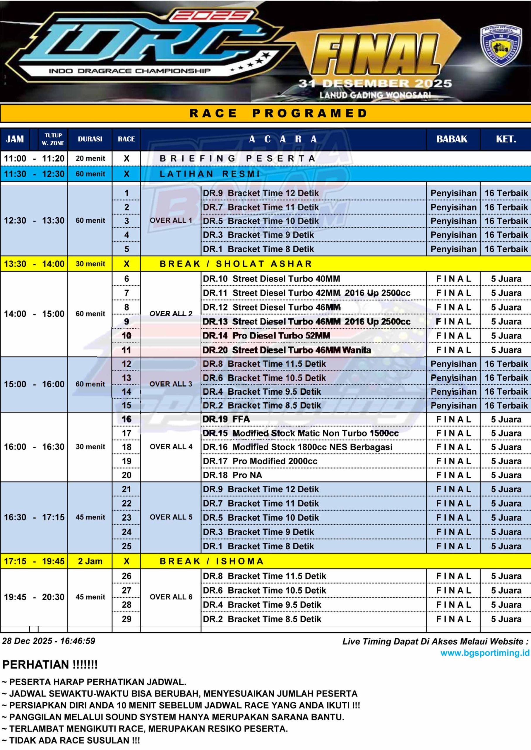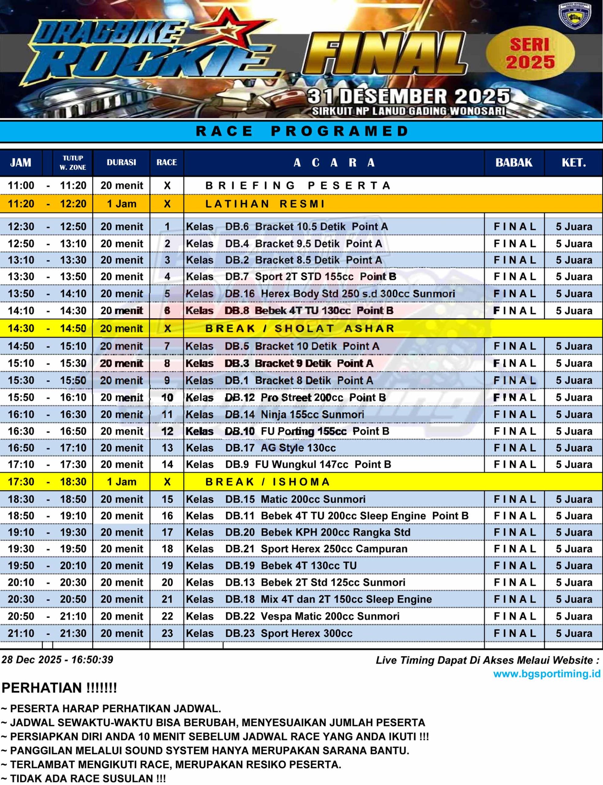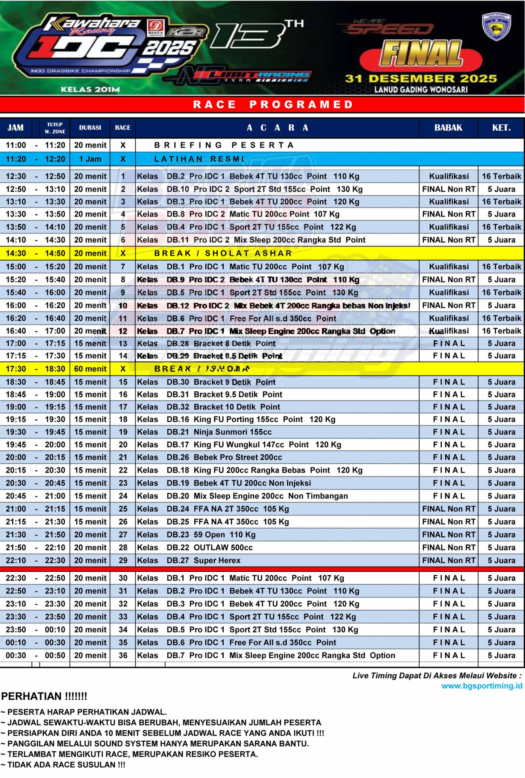 Istimewanya, baik gelaran Dragbike IDC dan Rookie, Dragrace IDRC ini merupakan partai penentu alias babak final yang akan digeber mulai pukul 11:00 hingga 00:50. Hyupe, berakhirnya 3 gelaran balap adu kebut ditrek lurus ini berasa makin spesial karena bertepatan dengan pergantihan tahun baru 2026.