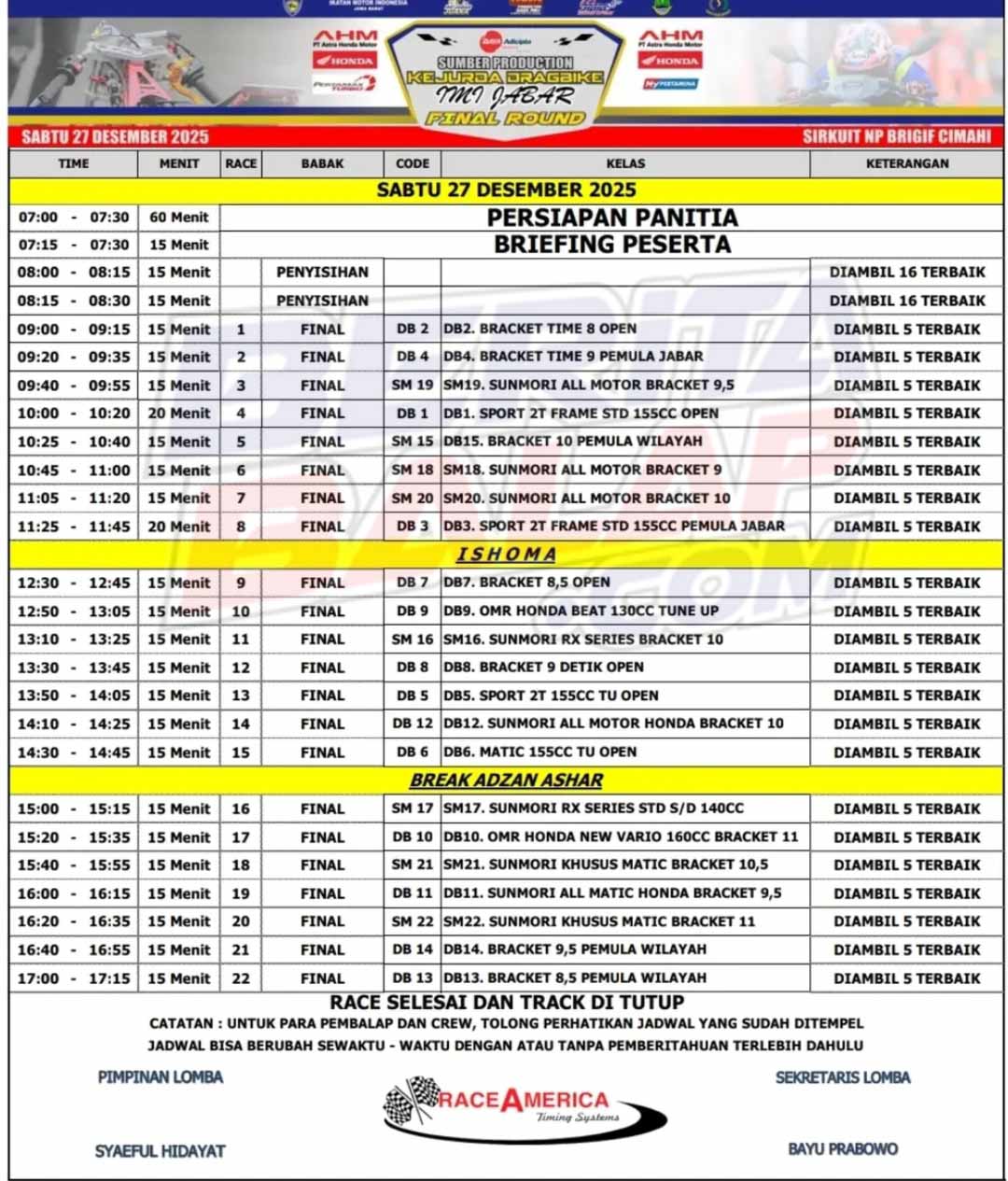 Nah, untuk jadwal racenya, akan di mulai dari pukul 08:00 dengan melangsungkan babak penyisihan. Dilanjut dengan mengagendakan babak final race hingga pukul 17:15 dan diakhiri dengan penyerahan hadiah. Biar makin jelasnya, langsung saja pantau jadwal race final Kekirda Drag Bike Jabar 2025 di bawah ini. Edhot
