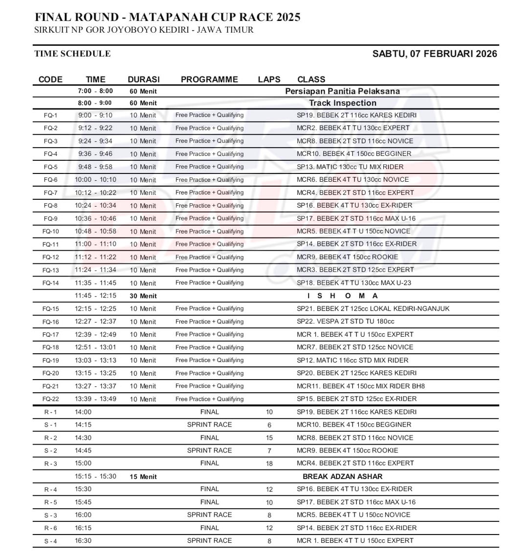 BeritaBalap.com- Babak pamungkas alias final Matapanah Cup Race (MCR) 2025 akan segera bergulir disirkuit non permanen GOR Joyoboyo, Kediri, Jatim pada 7-8 Februari akhir pekan ini. Berikut jadwal race final MCR 2025 yang hadir dengan tantangan dan bonus melimpah.