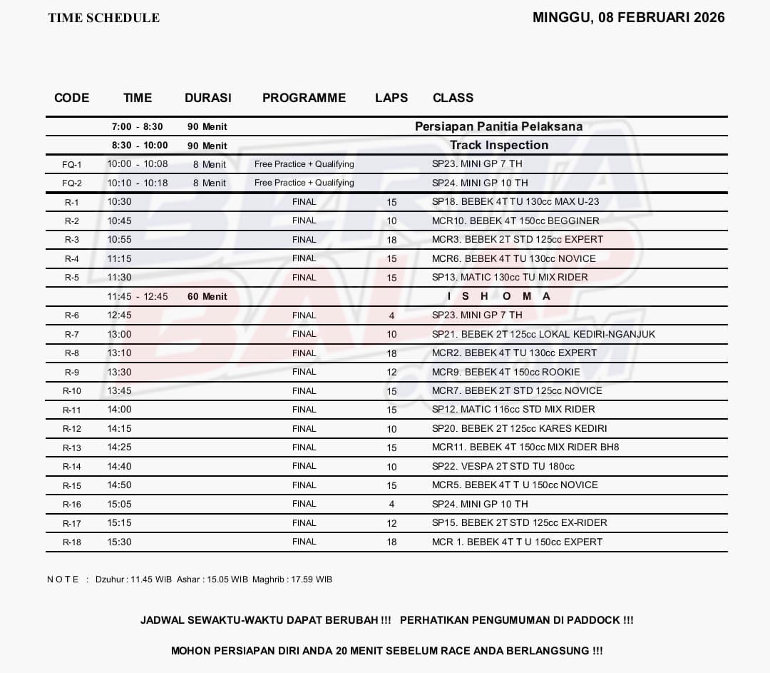 Nah, untuk jadwal race yang dimulai Sabtu, 7 Februari akan menghadirkan babak latihan + kualifikasi, beberapa final dan Sprint Race untuk beberapa kelas. Sedangkan hari berikutnya, Minggu, 8 Februari akan dibuka dengan latihan + kulaifikasi kelas MiniGP dilanjut merampungkan sesi final.