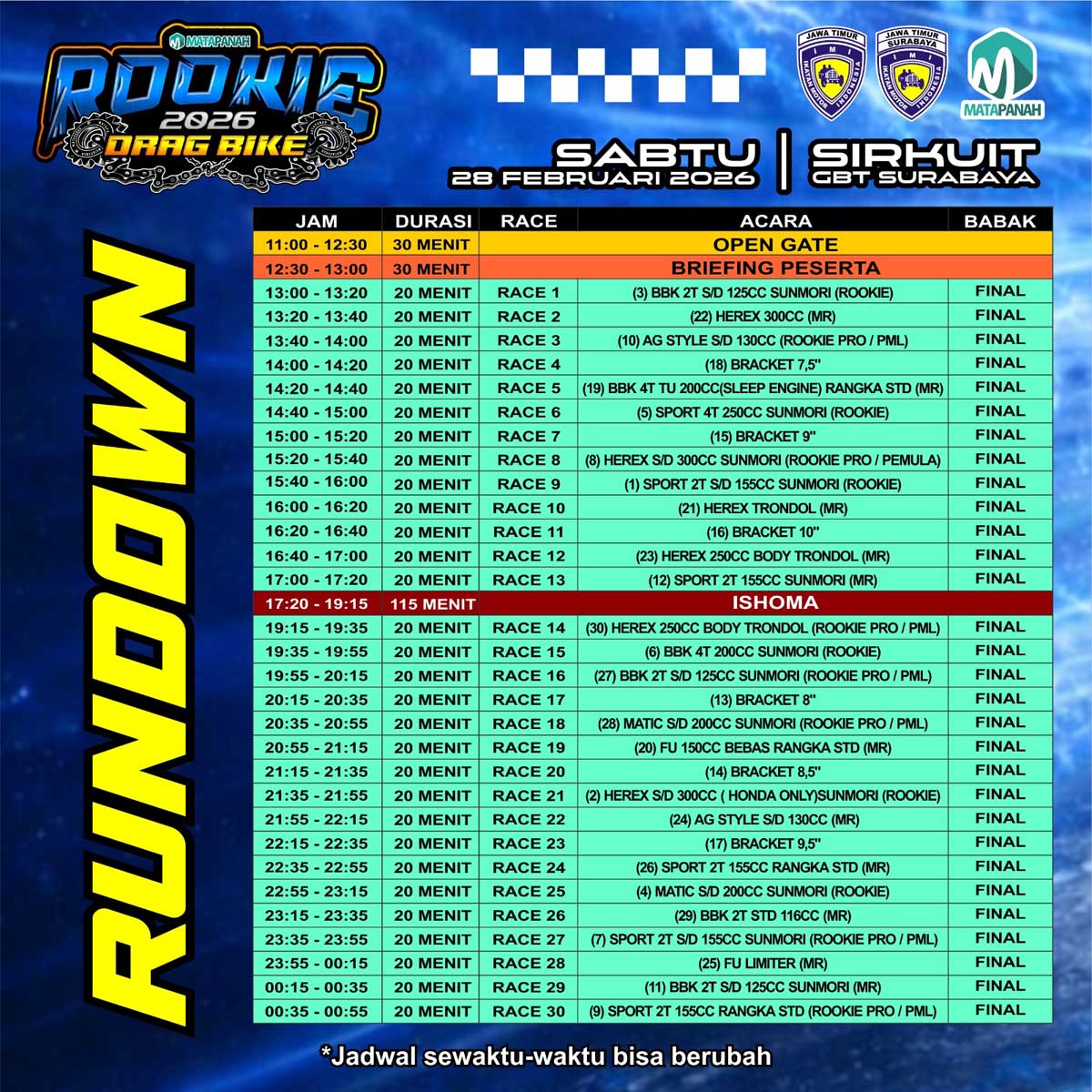 Ingat ya gaes, tidak ada babak penyisihan pada event kali ini dan akan langsung menggeber babak final disetiap sesinya. Nah, biar enggak terlewat langsung saja pantau dibawah ini jadwal Ramadhan Night Race Rookei Drag Bike 2026 Surabaya (28 Feb). Edhot
