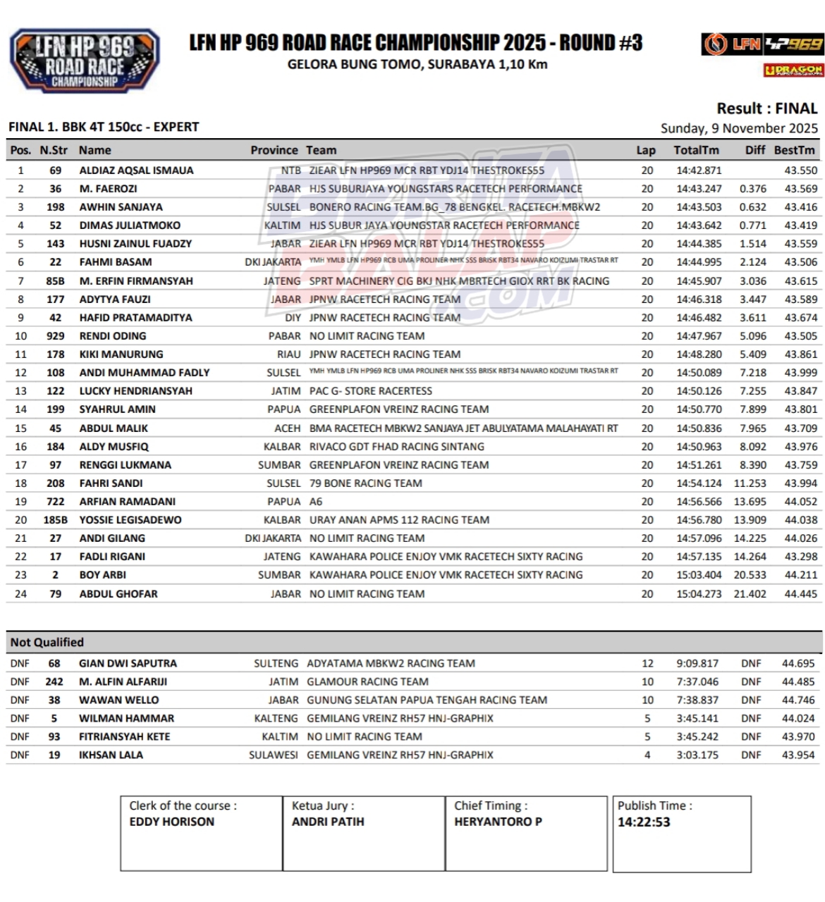 BeritaBalap.com- Suguhkanbjual beli serangan The Strokes55 berhasil membawa Aldiaz Aqsal Ismaya meraih kemenangan dramatis Bebek 4T 150cc (MP1) Expert di final LFN HP969 Road Race Championship 2025. Gelaran tersebut berlangsung diatas lintasan GBT, Surabaya (9/11).