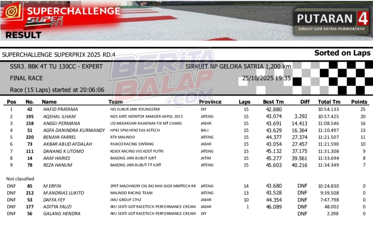 BeritaBalap.com- Sempat mendapat perlawanan dari Aqsal Ilham (M2S Akpol 201, namun pada akhirnya Hafid Pratama (HJS) yang dapat konsisten menjaga racing line meraih yang terbaik. Ini dalam gelaran seri ke-4 SuperPrix 2025 Purwokerto, Sabtu (25 Okt).