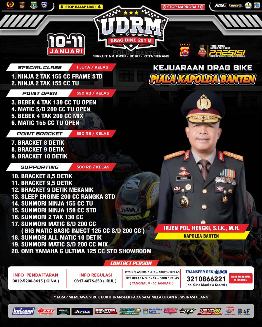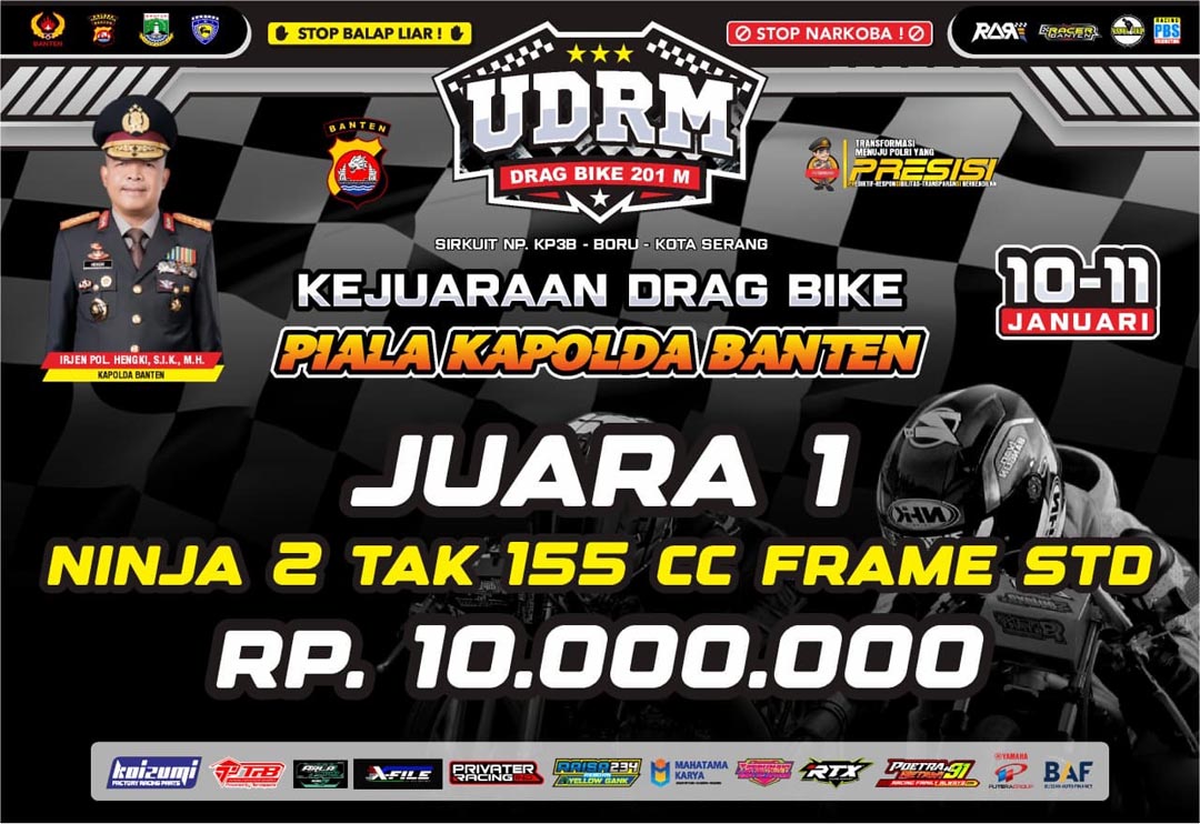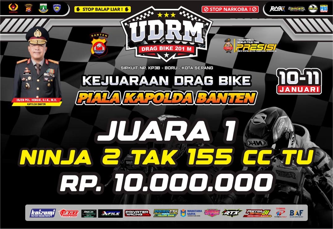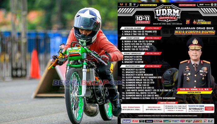 Tenang, totalnya ada 20 kelas yang akan diperlombakan pada gelaran balap yang akan memperebutkan piala Irjen Pol. Hengki, S.I.K., M.H. selaku Kapolda Banten. Cukup mengeluarkan kocek antara Rp 500 ribu hingga Rp 550 ribu (tergantung kelas) kalian bisa mengikuti gelaran balap ini.