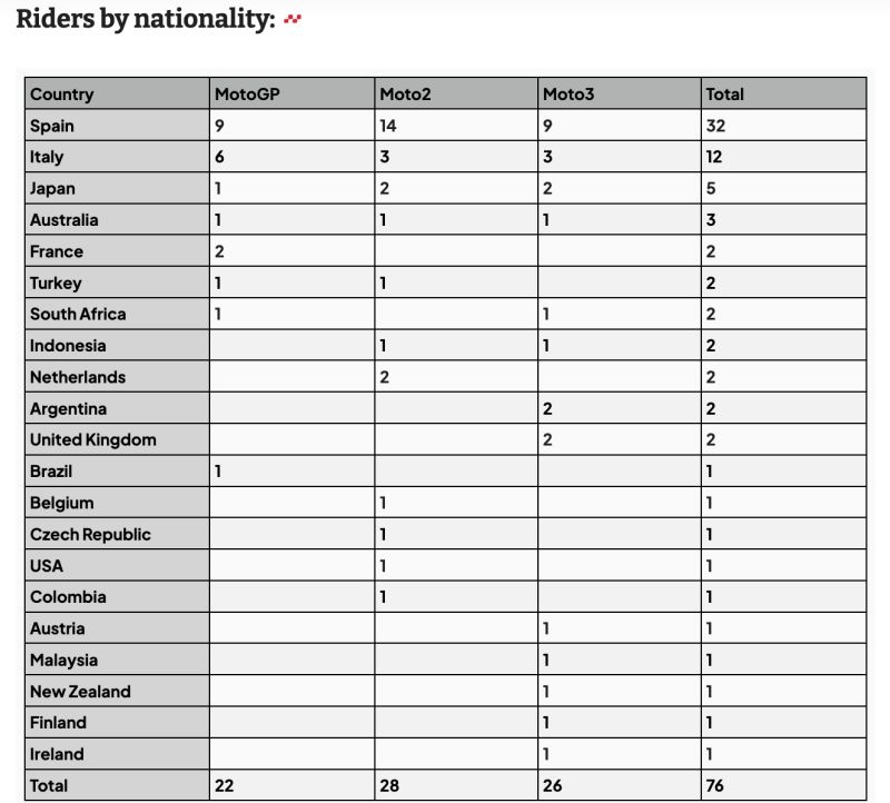 Total 76 pembalap dimana ada 32 racer adalah warga negara Spanyol dan 12 dari Italia. Itu 57,89 persen dari seluruh grid pada 3 kelas tersebut.