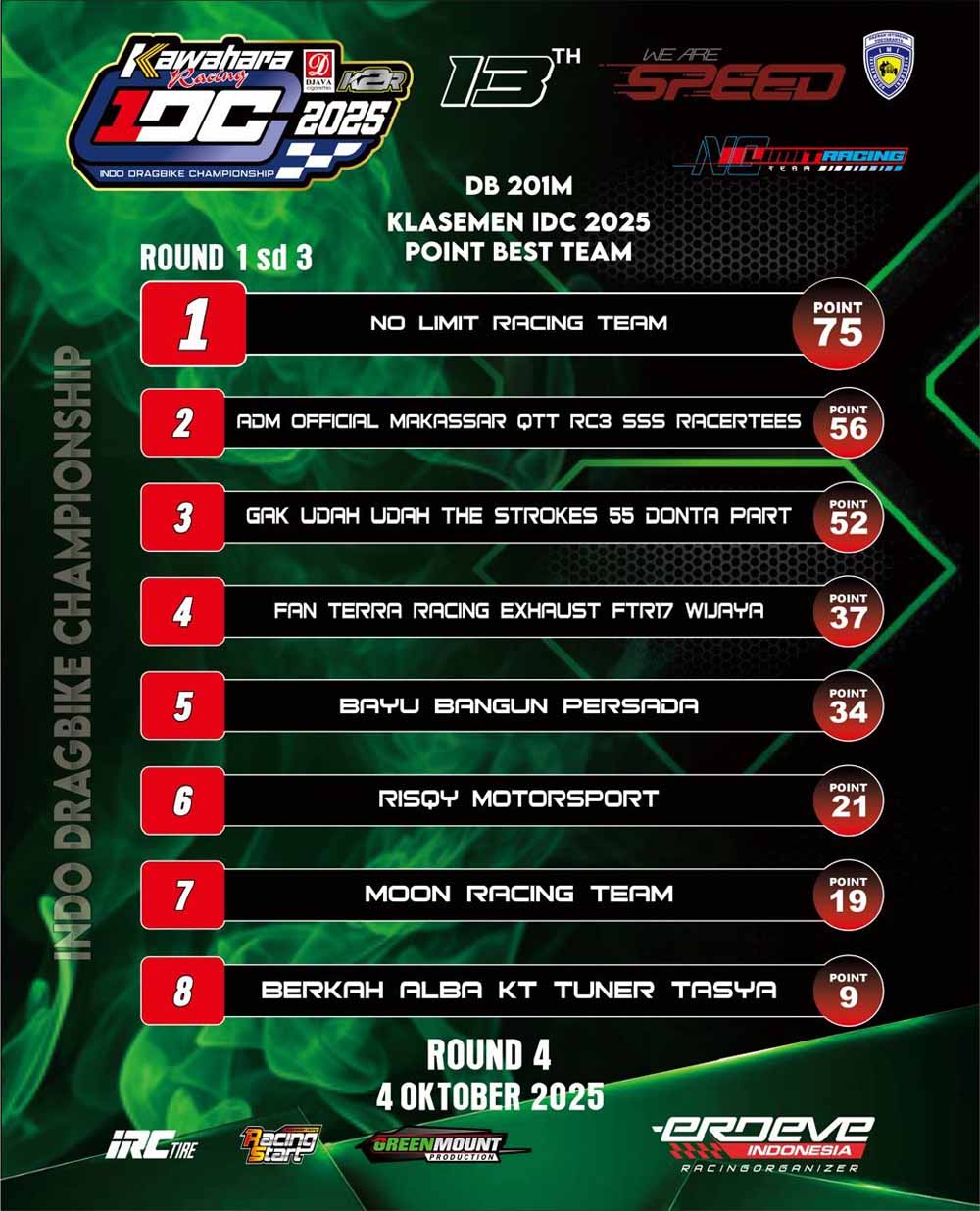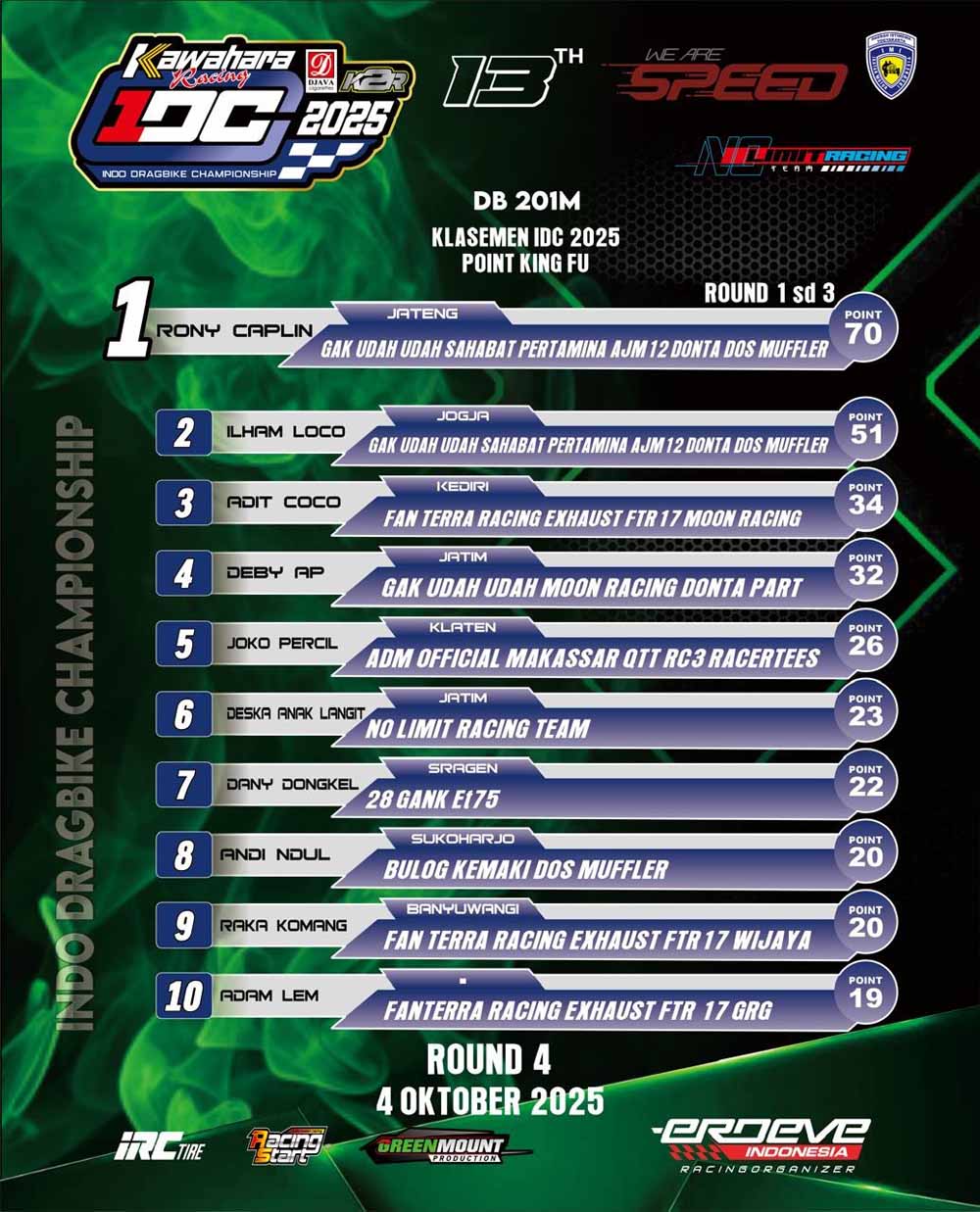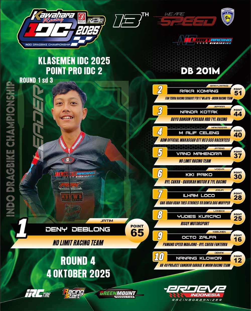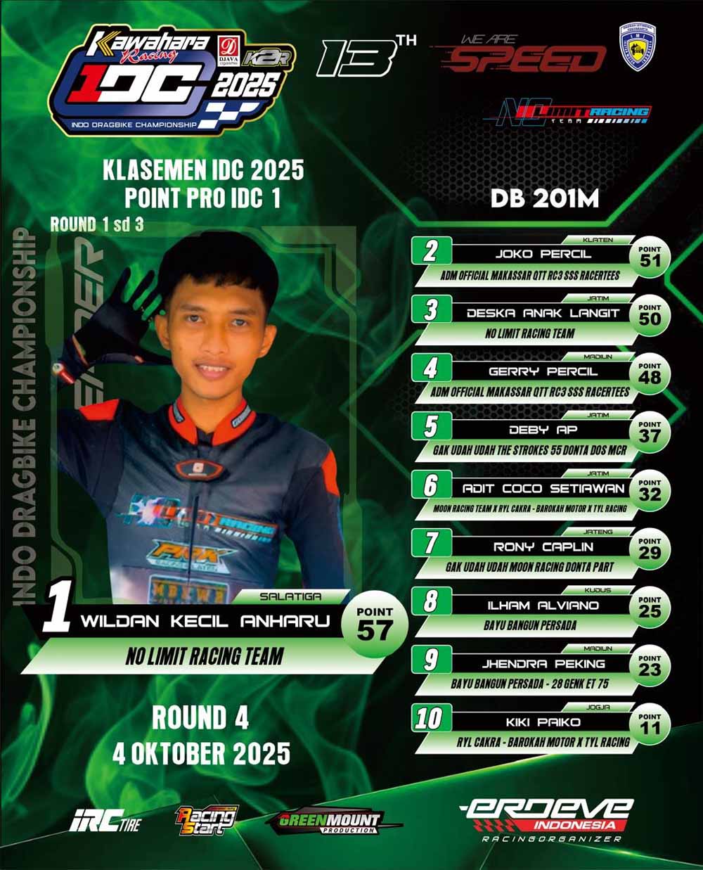 Dragbiker andalan No Limit Racing Team, Wildan Kecil Anharu untuk sementara memuncaki klasemen Pro IDC 1 dengan 57 poin. Sementara Joko Precil (ADM Official Makasar), dan Deska Anak Langit, rekan setimnya menempel ketat dengan 51 dan 50 poin.