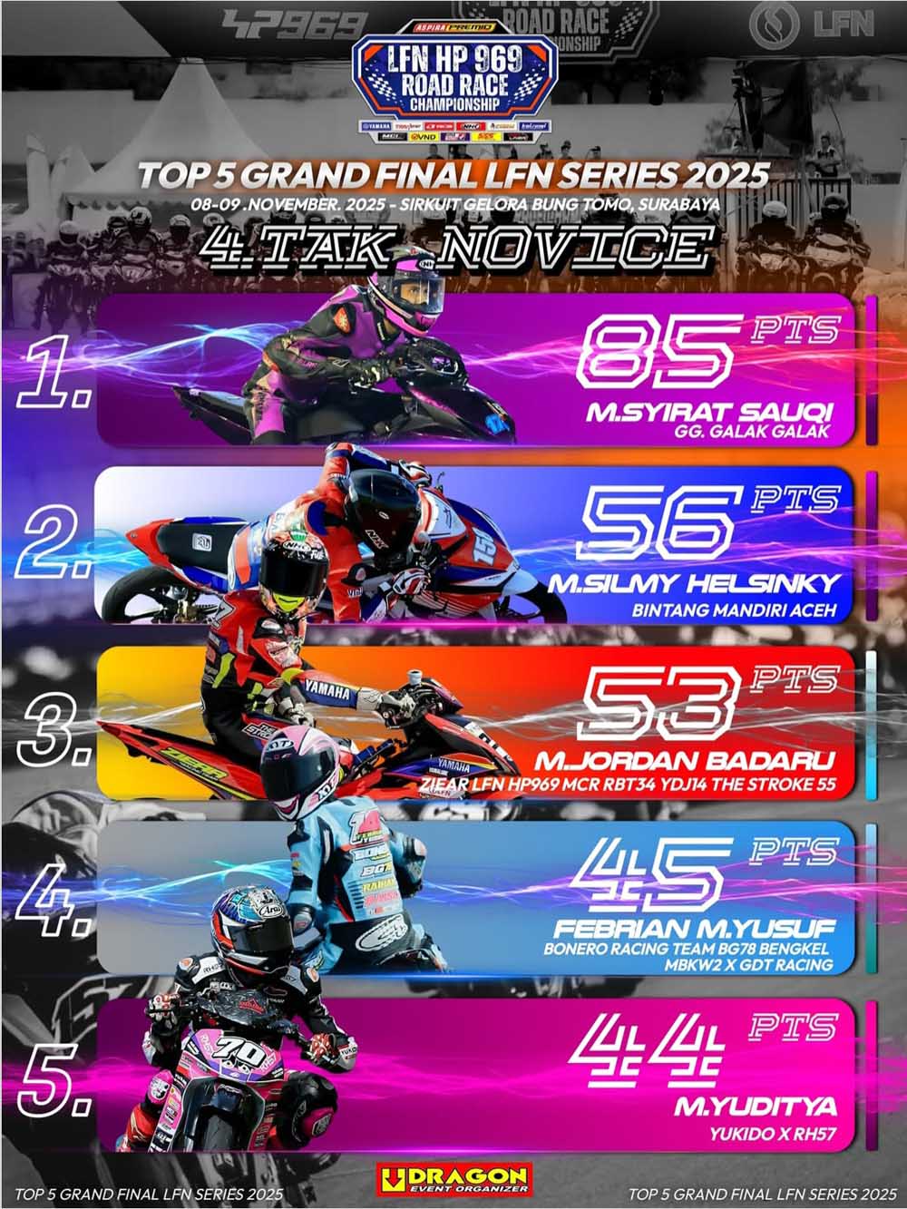 BeritaBalap.com- Pembalap asal Nanggroe Aceh Darussalam, M Syirat Sauqi berpeluang besar menyapu bersih gelar Juara Umum (JU) Novice total seri gelaran LFN HP969 Road Race 2025. Hyupe, babak pamungkasnya akan segera dihelat di sirkuit GBT, Surabaya pada 8-9 November akhir pekan ini.