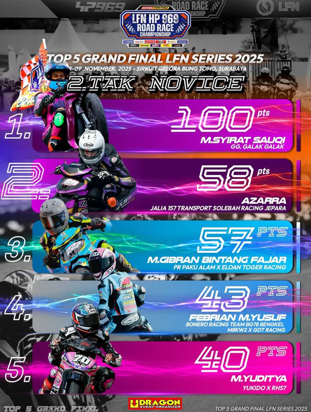 BeritaBalap.com- Pembalap asal Nanggroe Aceh Darussalam, M Syirat Sauqi berpeluang besar menyapu bersih gelar Juara Umum (JU) Novice total seri gelaran LFN HP969 Road Race 2025. Hyupe, babak pamungkasnya akan segera dihelat di sirkuit GBT, Surabaya pada 8-9 November akhir pekan ini.
