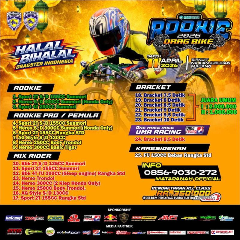 Dari sisi kompetisi, Matapanah Rookie Drag Bike 2026 menghadirkan banyak kelas yang dirancang untuk menjaring berbagai level pembalap, mulai dari rookie hingga rider mix rider. Variasi kelas yang semakin lengkap ini membuat persaingan dipastikan berlangsung sengit, sekaligus membuka ruang bagi talenta-talenta baru untuk unjuk kemampuan di lintasan.