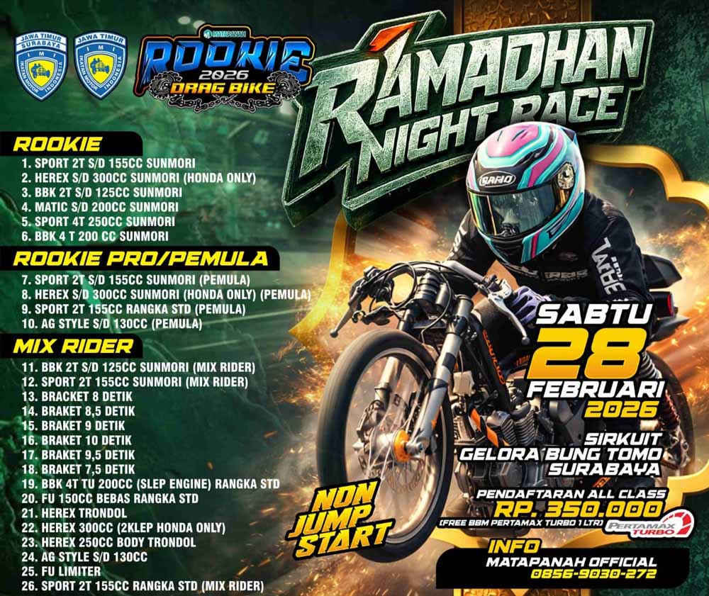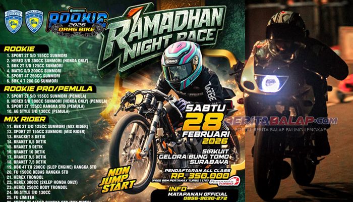 BeritaBalap.com- Matapanah siap menggelar Ramadhan Night Race Rookie Drag Bike 2026 di Sirkuit Gelora Bung Tomo, Surabaya pada Sabtu, 28 Februari. Event ini menjadi salah satu agenda balap yang dinantikan, menghadirkan konsep balap malam yang dikemas khusus untuk menyambut momentum Ramadhan.