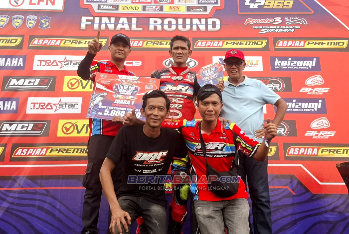 Irfan Chupenk saat menerima podium penghargaan tahta tertinggi Bebek 2 Tak Std 125 cc Exrider bersama skuad tim Neo Racing AR Speed DRF Performance dan Haji Iyan, sang ayah (topi merah)
