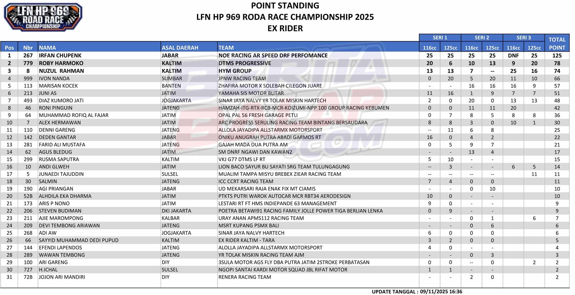 Hasil gemilang tersebut berlanjut pada babak pamungkas yang kembali meraih tahta tertinggi Bebek 2 Tak Std 125 cc Exrider namun gagal finish dikelas Bebek 2 Tak Std 116 cc Exrider. Meski demikian, Irfan Chupenk tetap sukses meraih gelar JU Exrider total seri di LFN HP969 Road Race 2025 dengan total 125 poin.