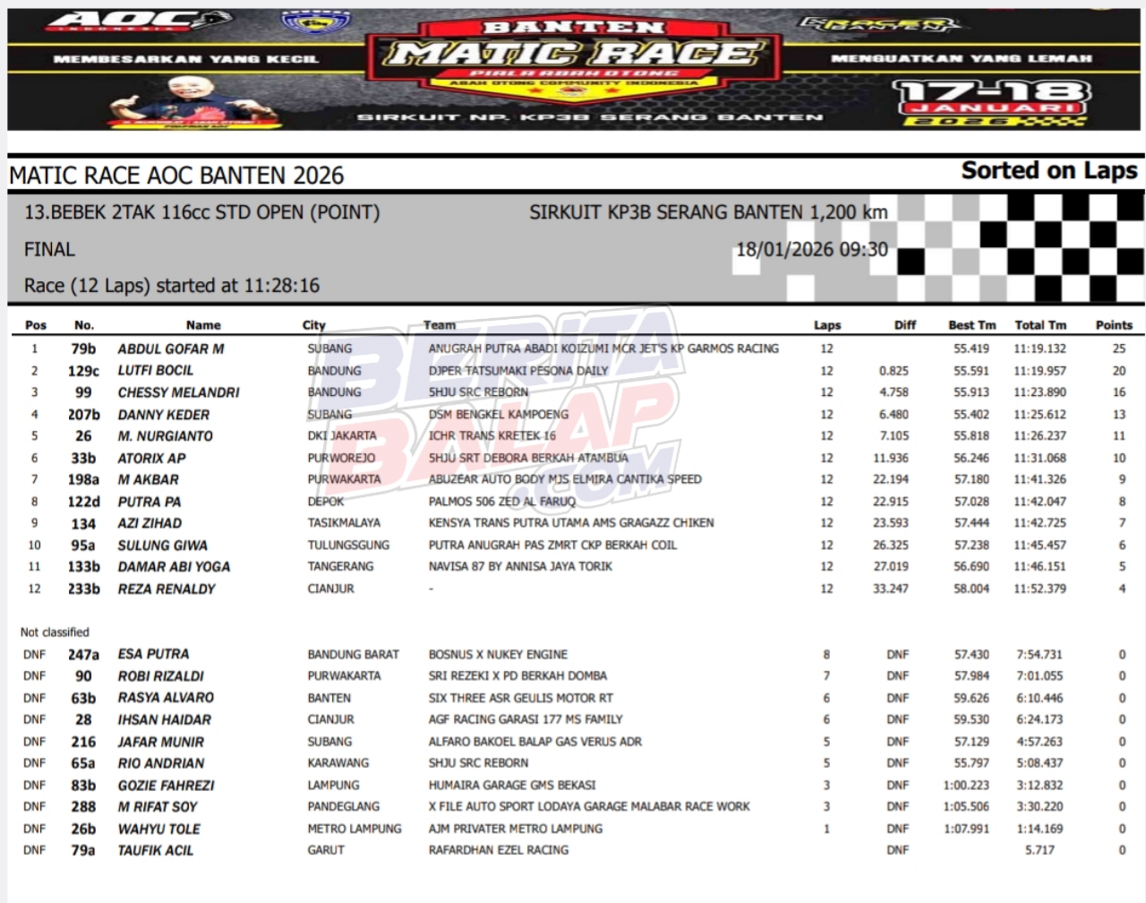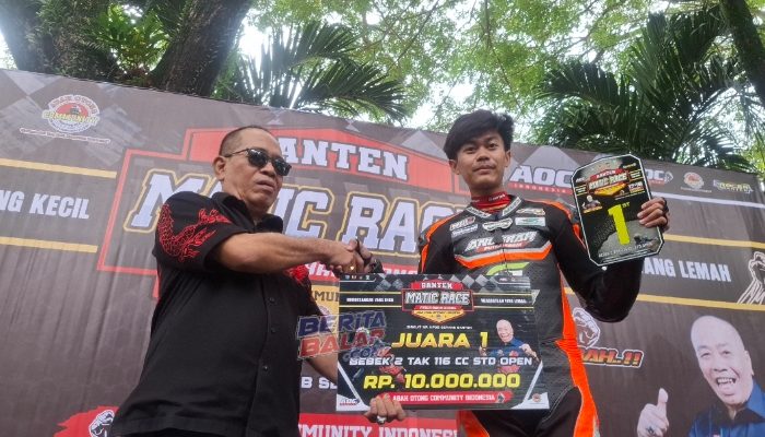 BeritaBalap.com- Bermain rapih dan penuh perhitungan, Abdul Gofar gondol Rp 10 Juta di Banten Matic Race Abah Otong 2026 yang berlangsung di lintasan non permanen KP3B Serang (18/1). Hyupe, itu setelah Abdul Gofar berhasil memenangkan persaingan sengit dikelas Bebek 2T 116cc Std Open.