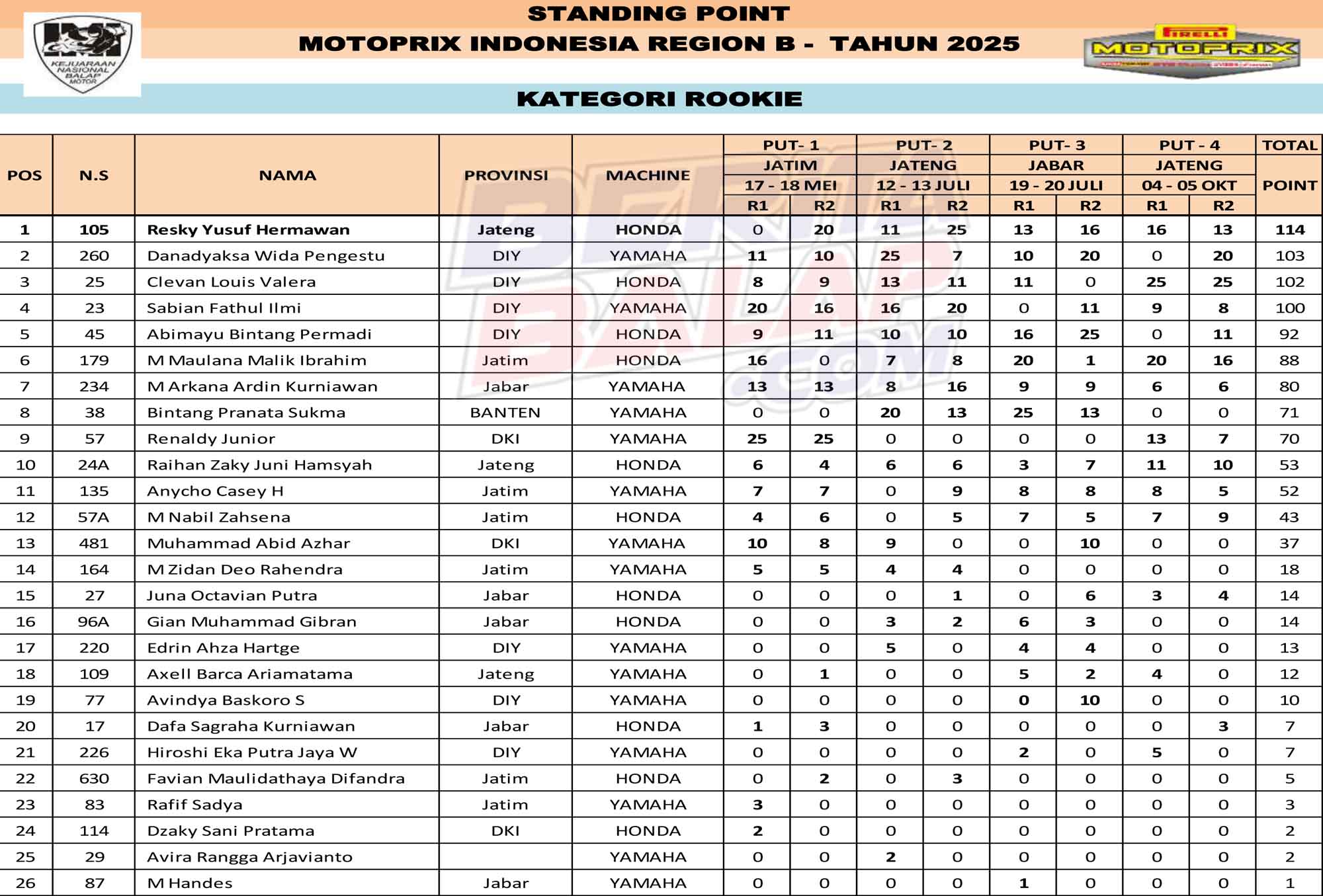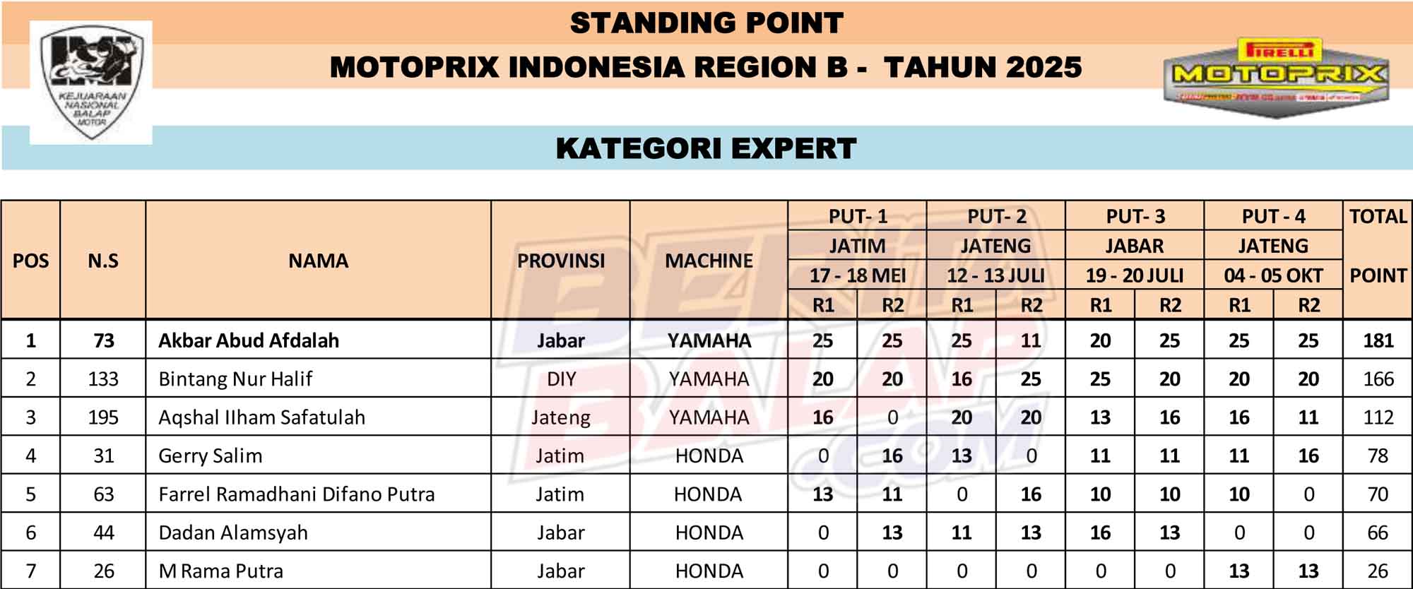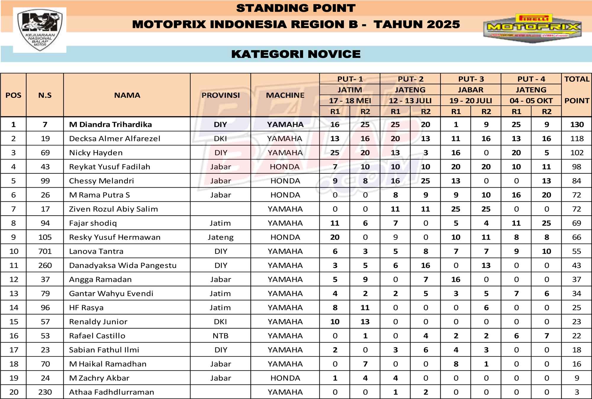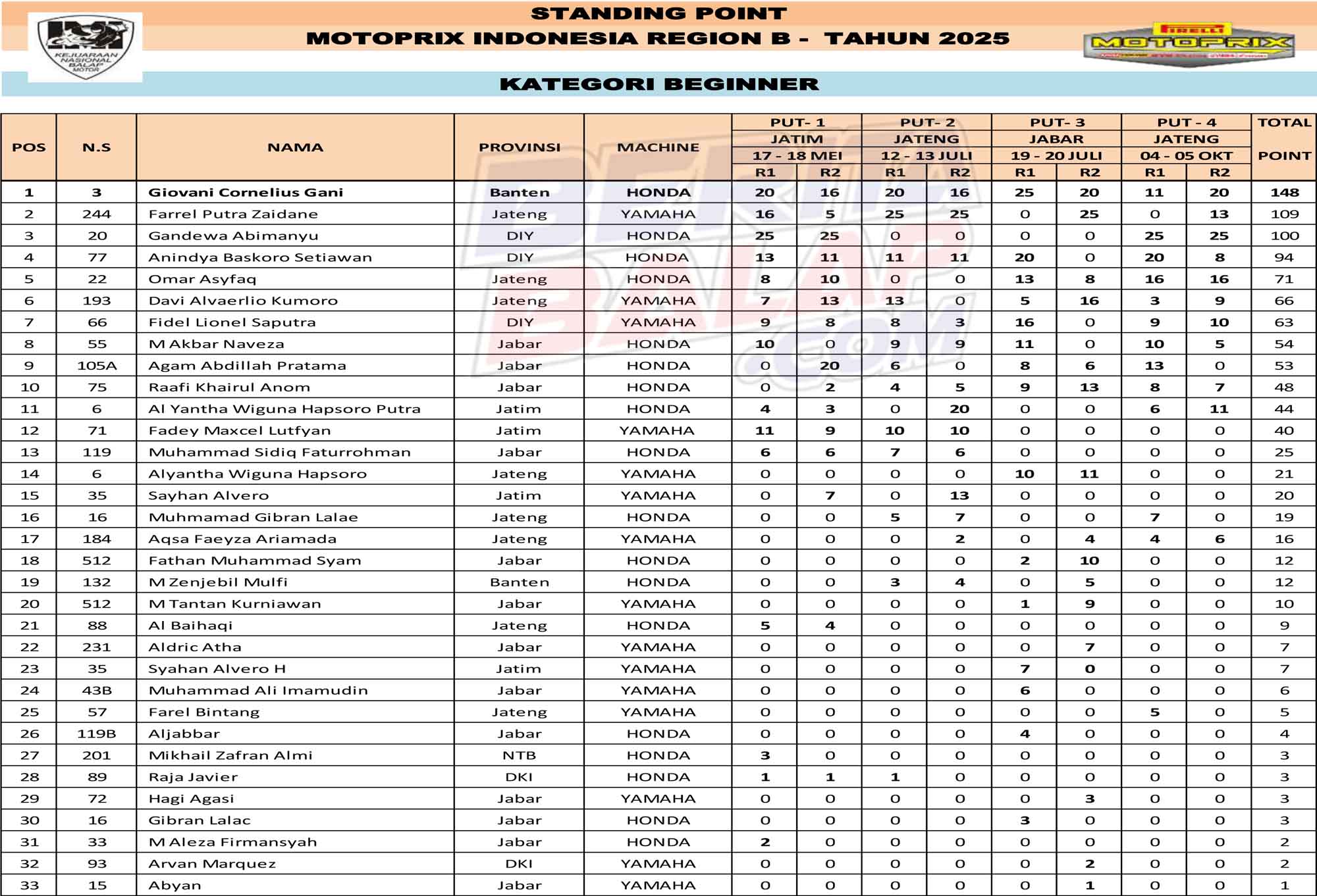 Klasemen Akhir Kejurnas Motoprix 2025 Region B :