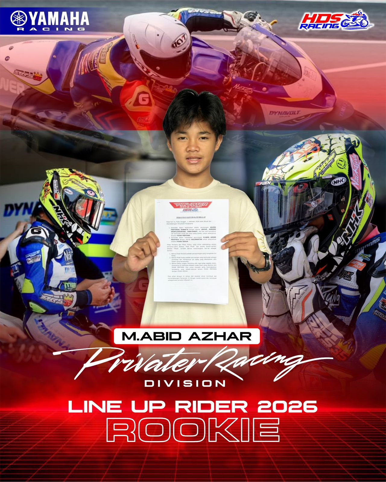 BeritaBalap.com- Privater Racing menambah amunisi, kali ini menggaet M Abid Azhar untuk mengarymi musim balap 2026. Pembalap muda asal Sangtta, ibu kota Kabupaten Kutai Timur, Kalimantan Timur ini di daulat untuk bersaing di kelas Rookie.