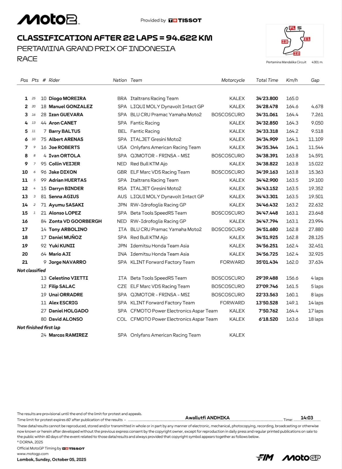BeritaBalap.com- Pembalap asal Brasil yang bermukim di Spanyol, Diogo Moreira berhasil meraih podium juara Moto2 Mandalika Lombok, Minggu (5 Okt). Jadi menyempurnakan pencapaian yang merebut pole position dalam sesi kualifikasi Sabtu