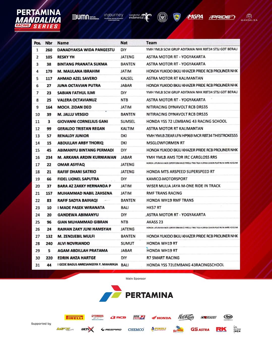 Sebelumnya Aksa GDT Racing berbeda 24 poin dari gacoan Honda Yukido, Abimanyu Fermadi. Namun di race awal, Abimanyu yang sempat tarung di barisan depan harus puas finish ke-15 alias bertambah 1 poin.