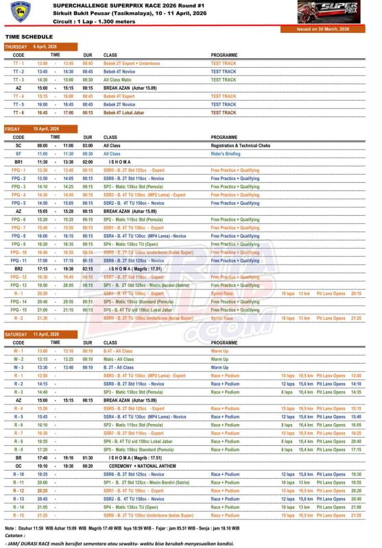 Jadwal Race & Daftar Kelas Superprix 2026 Seri 1 Tasikmalaya :