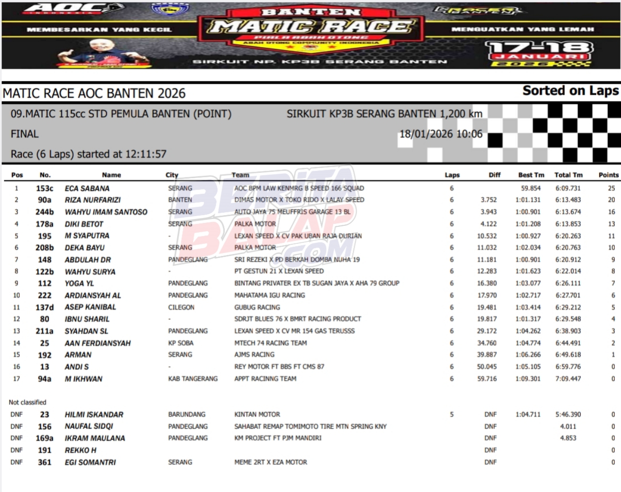 BeritaBalap.com- Tampil dominan, Irfan Akbar Bawa Pulang Rp 20 juta Lebih di Banten Matic Race Abah Otong 2026. Tepatnya pada gelaran balap yang berlangsung diatas lintasan non permanen KP3B Serang (18/1).