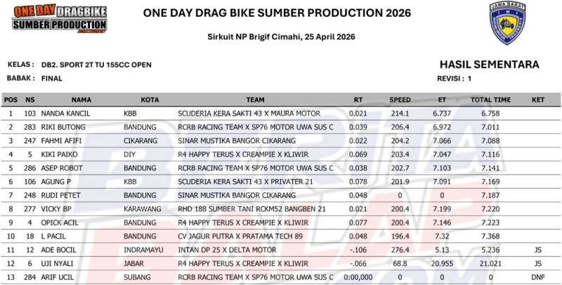 BACA JUGA : Hasil Juara One Day Drag Bike Sumber Production 2026 Cimahi