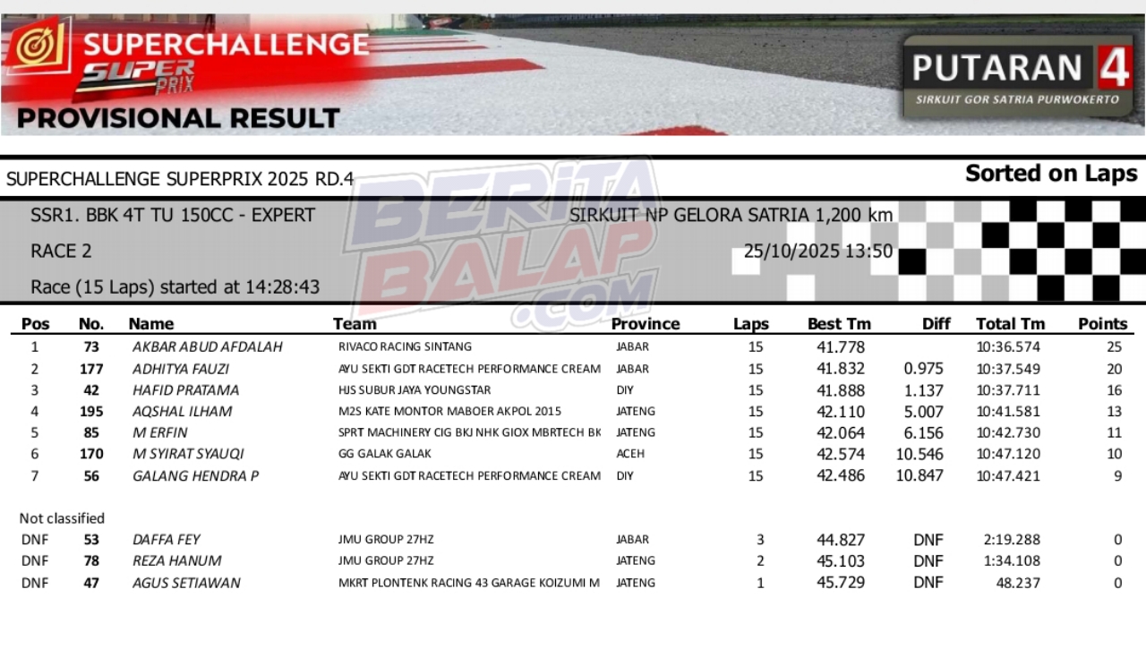 BeritaBalap.com- Tiada ampun ! Akbar Abud berhasil menjadi Jawara race 2 kelas Bebek 4T 150cc TU Expert (MP1) diajang SuperPrix 2025 Purwokerto. Hal tersebut terpantau langsung pada gelaran balap yang berlangsung dilintasan NP GOR Satria, Purwokerto (25/10).