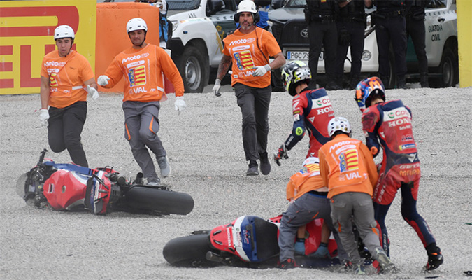 Disini mulai bencananya ketika ban depan Joan Mir selip dan kehilangan kendali. Bahkan pula kejadian ini memberikan efek negatif pada racer Honda Lainnya. Alex Espargaro, test rider Honda yang bersaing sebagai wildcard harus menghindari Joan Mir hingga harus puas finish di belakang.