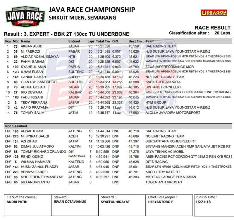 Tak menyia-nyiakan kesempatan, Akbar Abud langsung mengambil alih jalannya balap hingga bendera finish dikibarkan. “Secara keseluruhan motor juga sudah sangat oke. Karena bisa langsung push sejak awal dibarisan depan dan akhirnya bisa memaksimalkan momentum,” pungkas Abud. Edhot