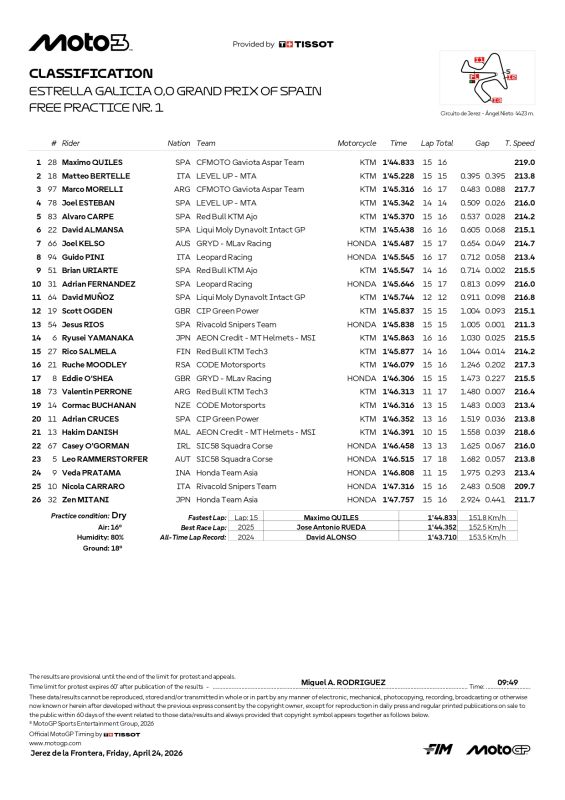 Oke kita tunggu saja ya perkembangan berikutnya di sesi Practice yang akan menentikan 14 terbaik yang langsung menuju kualifikasi 2 (Q2) alias tidak perlu menjalani kualifikasi 1 lagi.