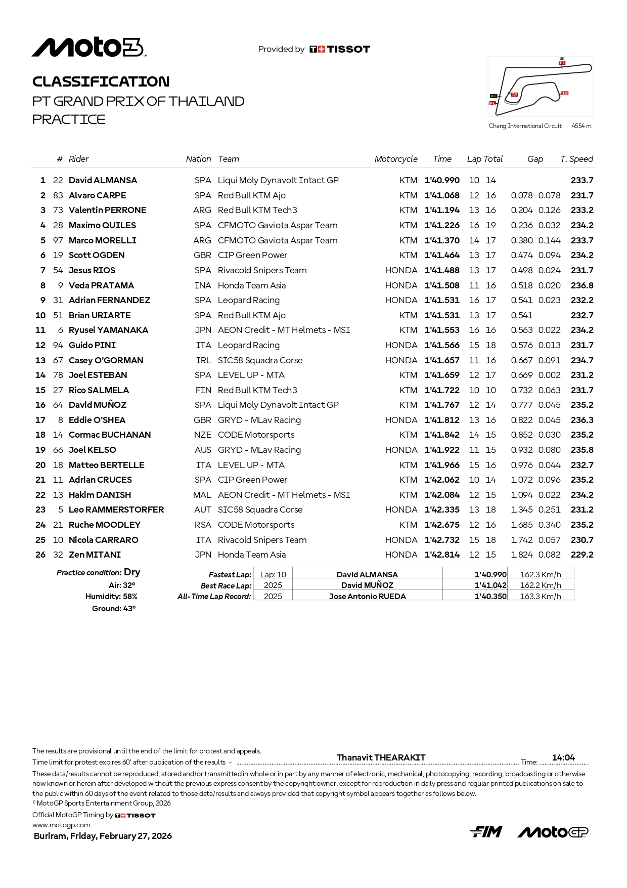 Catatan waktu Veda Ega Pratama ialah 1 menit 41,508 detik. Gapnya 0,508 detik dari urutan terdepan milik David Almansa. Tentu saja, ini menjadi catatan penting sehubungan perfoma pembalap asal Yogyakarta usia 17 tahun tersebut.